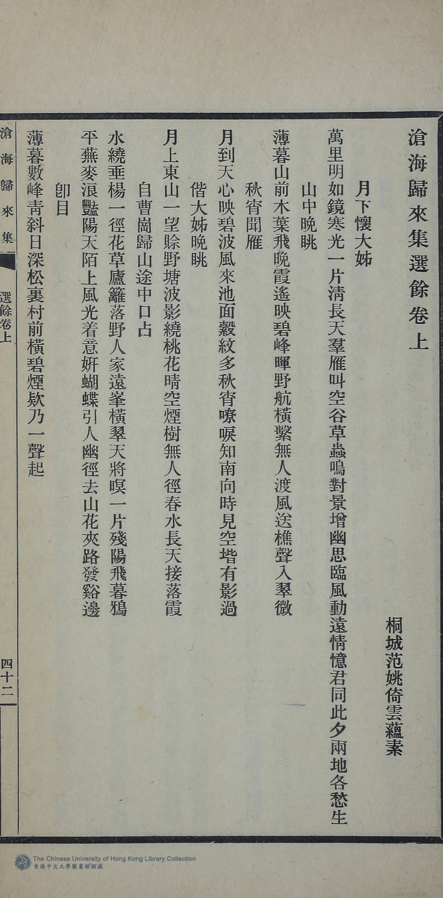 | 原書: 滄海歸來集:詩十一卷,詞一卷,續集一卷,餘卷二卷,消愁吟二卷,文一卷(清姚倚雲撰) |