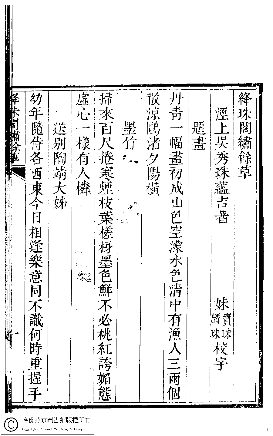 | 原書: 絳珠閣繡餘草﹕一卷﹔詩餘﹕一卷(清吳秀珠撰) |