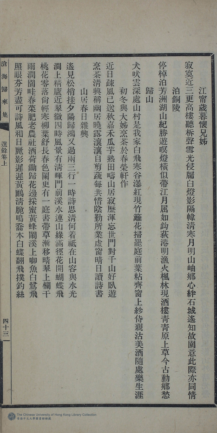 | (PRINT FRIENDLY VERSION) 滄海歸來集:詩十一卷,詞一卷,續集一卷,餘卷二卷,消愁吟二卷,文一卷(清姚倚雲撰)。民國三十三年(1944)或其後排印本 ![]() 頁碼 : 選餘卷上.43b | 点 击 放 大 | 滄海歸來集:詩十一卷,詞一卷,續集一卷,餘卷二卷,消愁吟二卷,文一卷(清姚倚雲撰)。民國三十三年(1944)或其後排印本![]() 頁碼 : 選餘卷上.43a | 点 击 放 大 | 返回 |