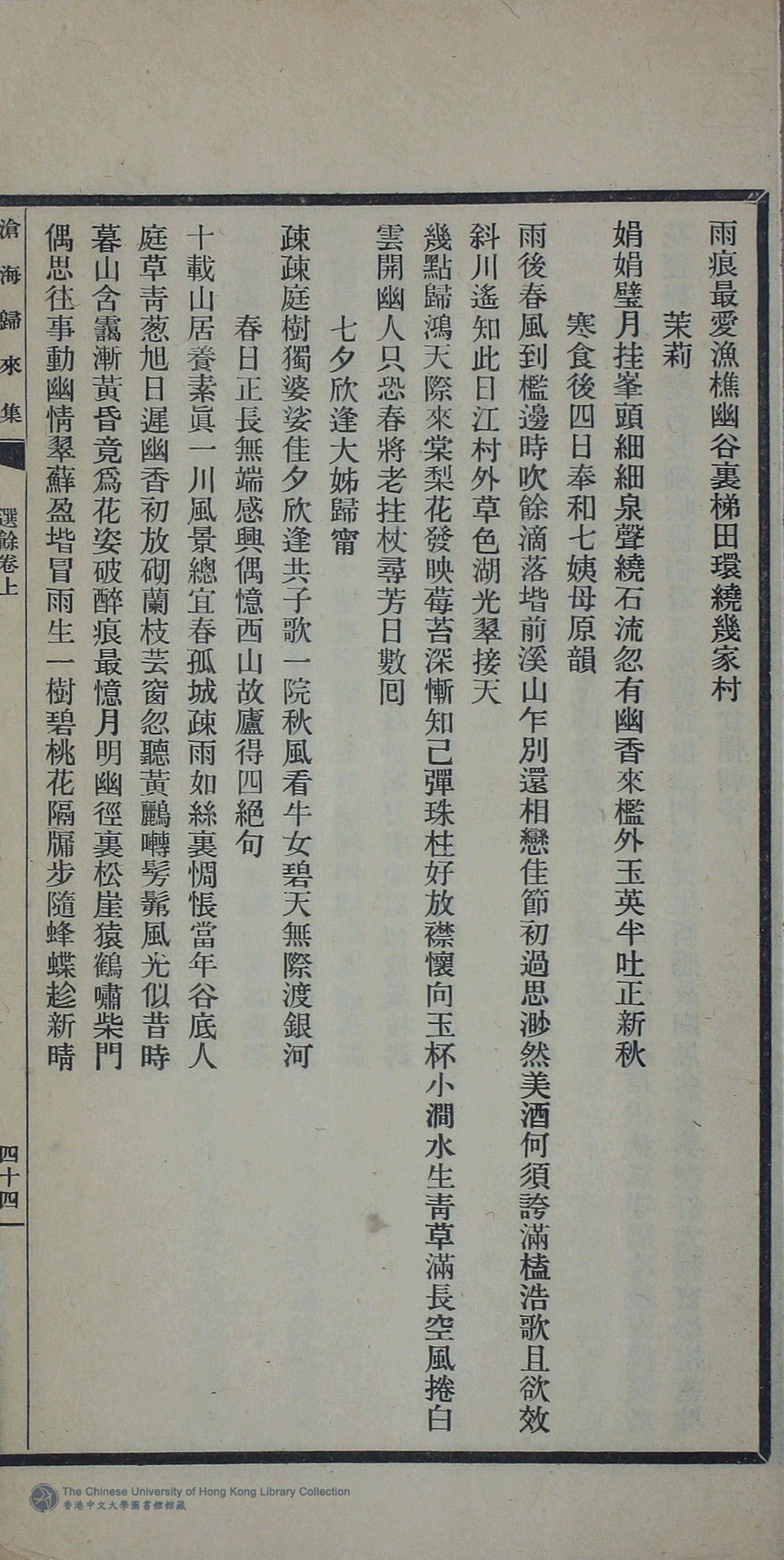 | (PRINT FRIENDLY VERSION) 滄海歸來集:詩十一卷,詞一卷,續集一卷,餘卷二卷,消愁吟二卷,文一卷(清姚倚雲撰)。民國三十三年(1944)或其後排印本 ![]() 頁碼 : 選餘卷上.44a | 点 击 放 大 | 返回 |