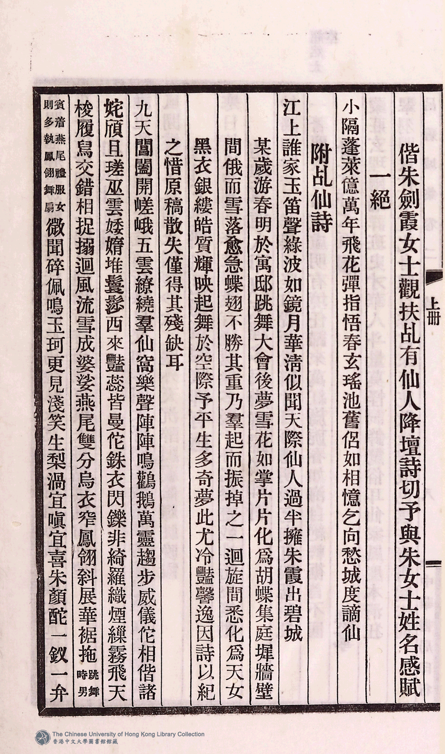 詩詞 [偕朱劍霞女士觀扶乩有仙人降壇詩切予與朱女士姓名感賦一絕]