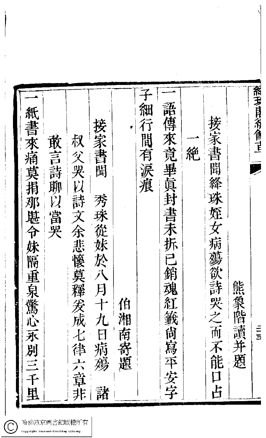 詩詞 [接家書聞絳珠姪女病殤欲詩哭之而不能口占一絕]