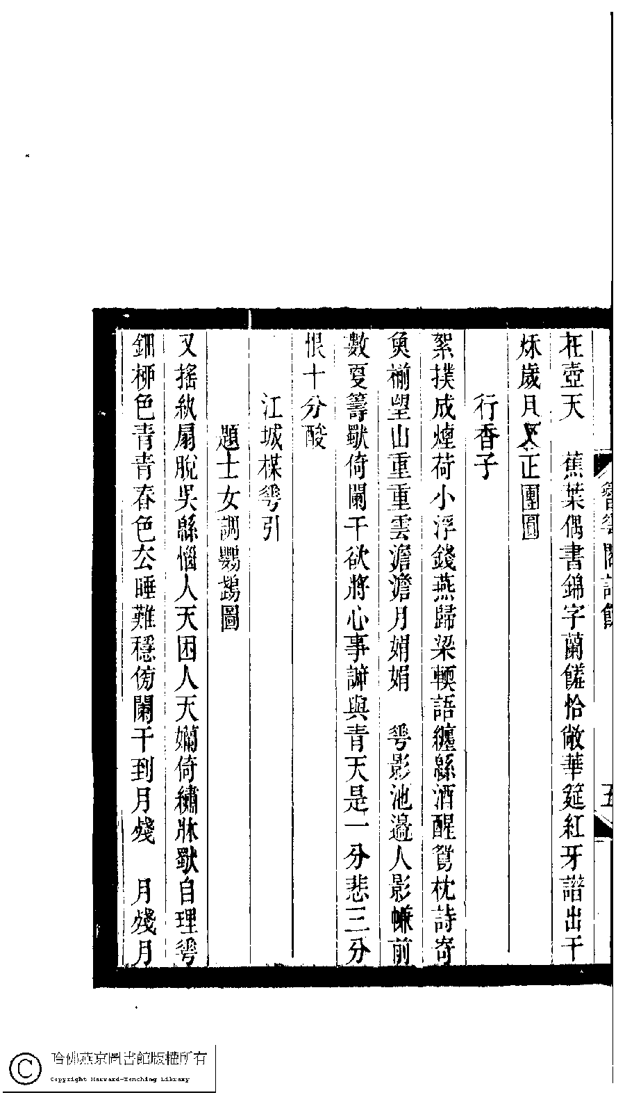 | (PRINT FRIENDLY VERSION) 小檀欒室彙刻閨秀詞﹕十集一百種一百卷(清徐乃昌輯) : 簪花閣詩餘﹕一卷。清光緒二十二年(1896)南陵徐氏刻本。 ![]() Page : 簪花閣詩餘.5b | click for larger image | 小檀欒室彙刻閨秀詞﹕十集一百種一百卷(清徐乃昌輯) : 簪花閣詩餘﹕一卷。清光緒二十二年(1896)南陵徐氏刻本。![]() Page : 簪花閣詩餘.5a | click for larger image | Back |