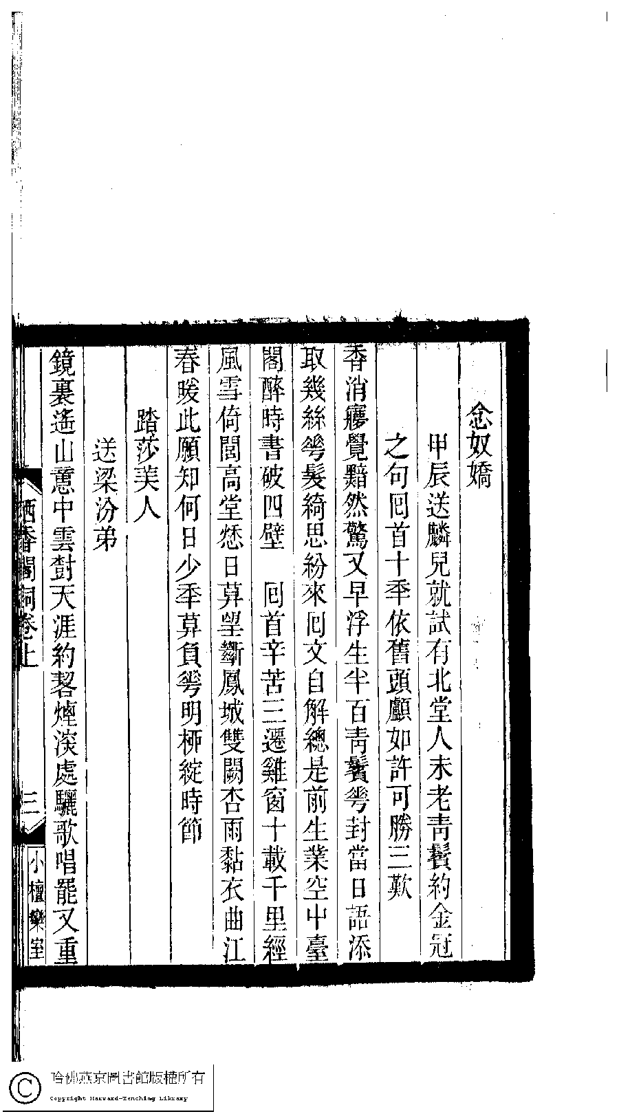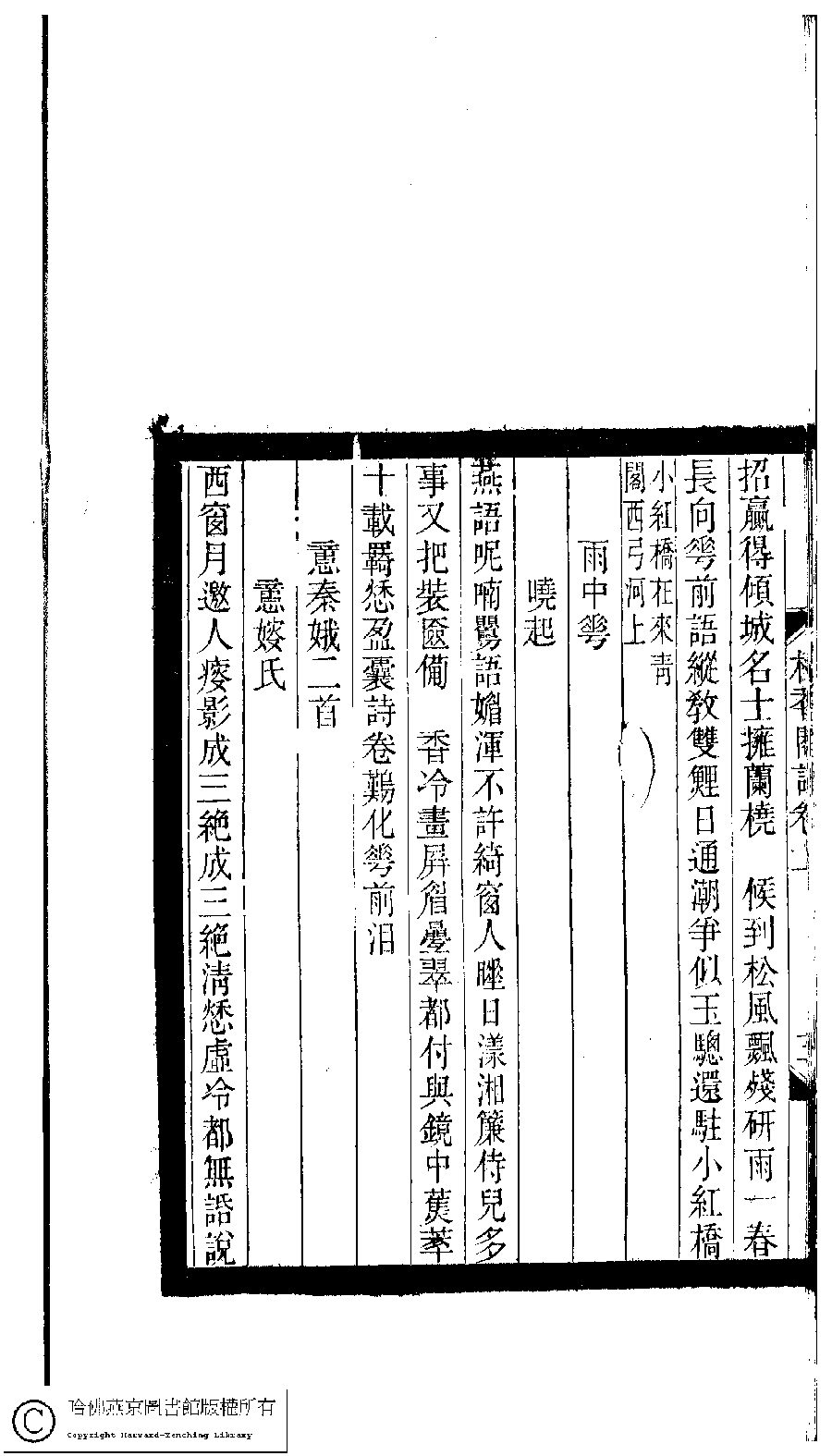 | (PRINT FRIENDLY VERSION) 小檀欒室彙刻閨秀詞﹕十集一百種一百卷(清徐乃昌輯) : 棲香閣詞﹕二卷。清光緒二十二年(1896)南陵徐氏刻本。 ![]() Page : 卷上.3b | click for larger image | 小檀欒室彙刻閨秀詞﹕十集一百種一百卷(清徐乃昌輯) : 棲香閣詞﹕二卷。清光緒二十二年(1896)南陵徐氏刻本。![]() Page : 卷上.3a | click for larger image | Back |