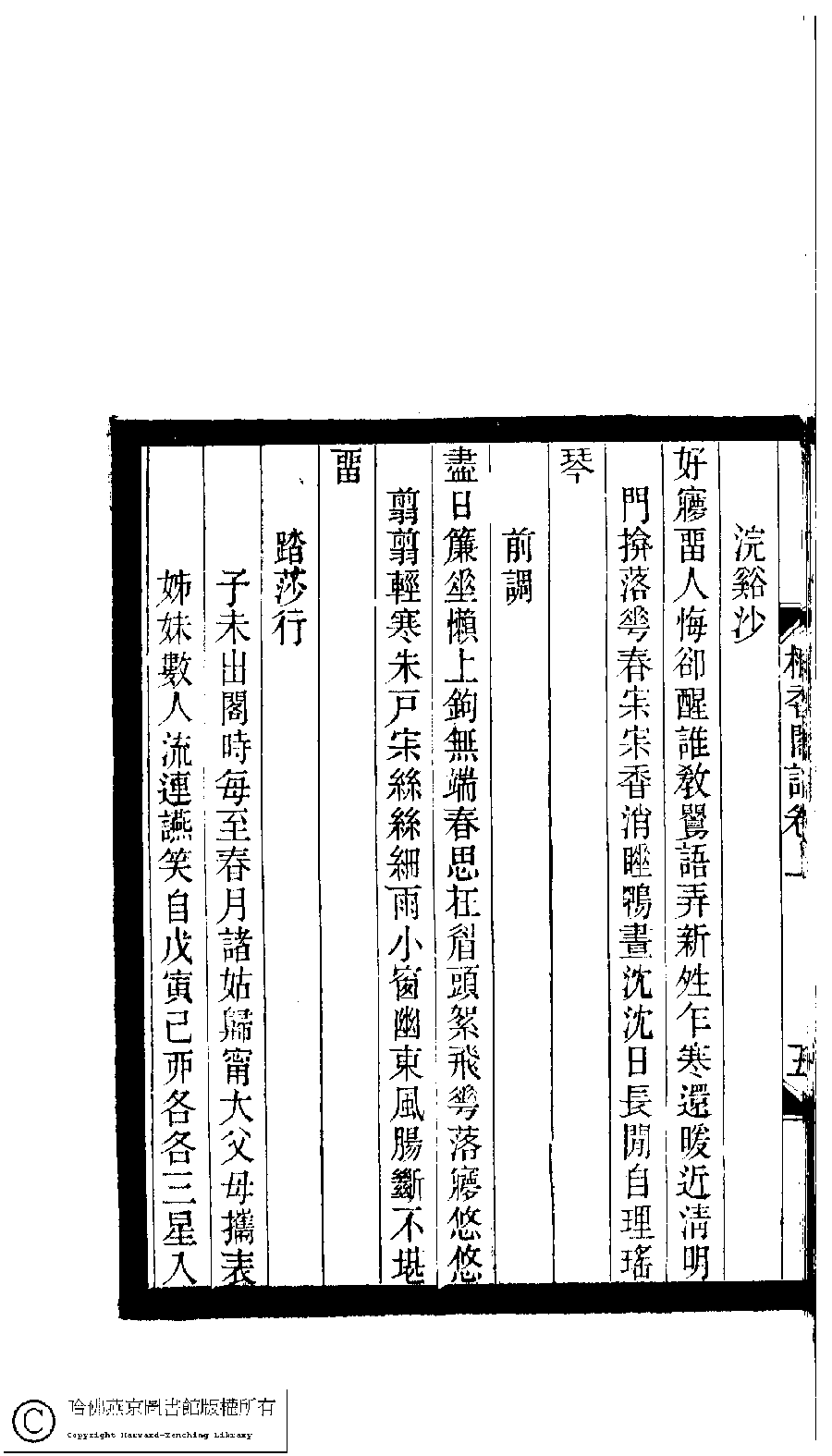 | (PRINT FRIENDLY VERSION) 小檀欒室彙刻閨秀詞﹕十集一百種一百卷(清徐乃昌輯) : 棲香閣詞﹕二卷。清光緒二十二年(1896)南陵徐氏刻本。 ![]() Page : 卷上.6a | click for larger image | 小檀欒室彙刻閨秀詞﹕十集一百種一百卷(清徐乃昌輯) : 棲香閣詞﹕二卷。清光緒二十二年(1896)南陵徐氏刻本。![]() Page : 卷上.5b | click for larger image | Back |