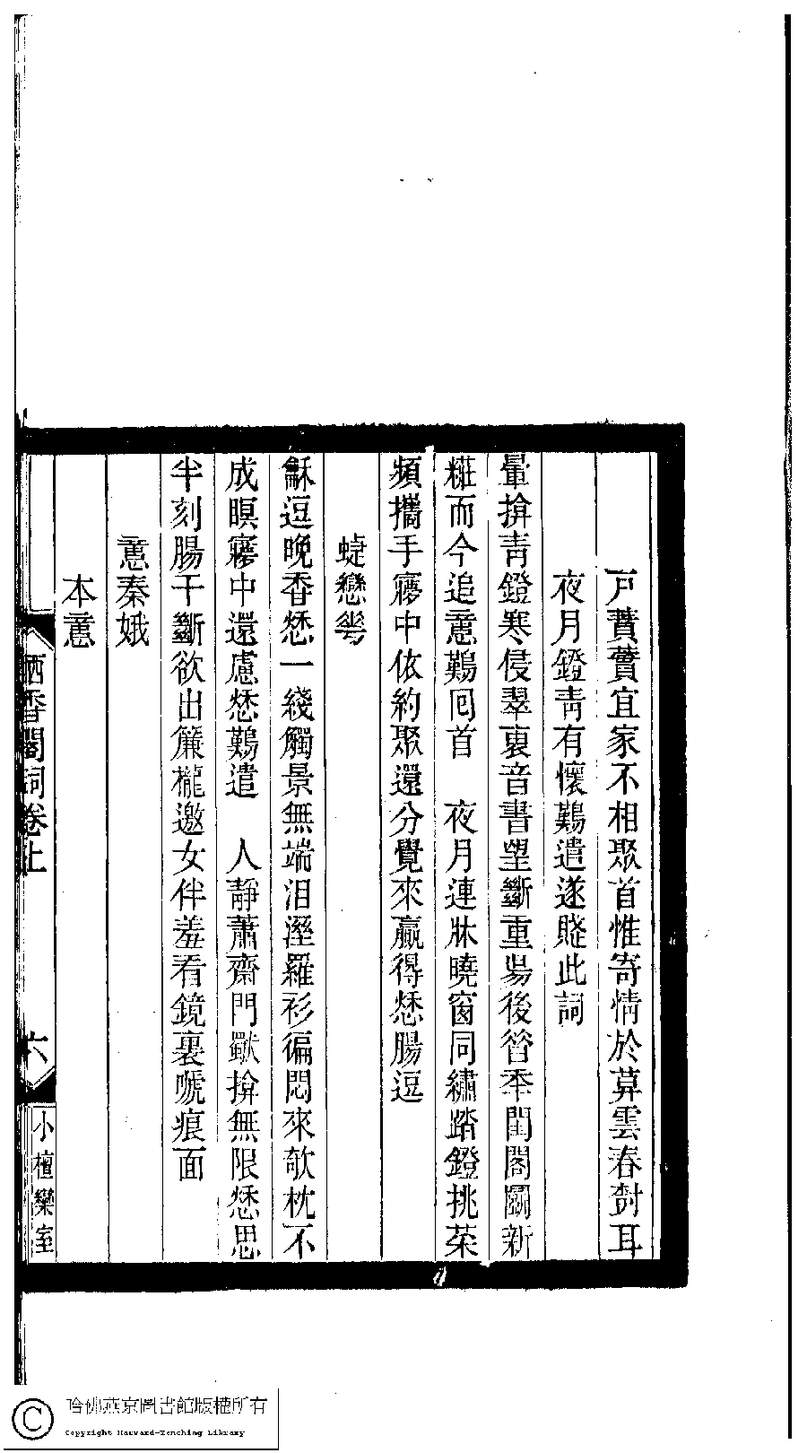 | (PRINT FRIENDLY VERSION) 小檀欒室彙刻閨秀詞﹕十集一百種一百卷(清徐乃昌輯) : 棲香閣詞﹕二卷。清光緒二十二年(1896)南陵徐氏刻本。 ![]() Page : 卷上.6b | click for larger image | 小檀欒室彙刻閨秀詞﹕十集一百種一百卷(清徐乃昌輯) : 棲香閣詞﹕二卷。清光緒二十二年(1896)南陵徐氏刻本。![]() Page : 卷上.6a | click for larger image | Back |