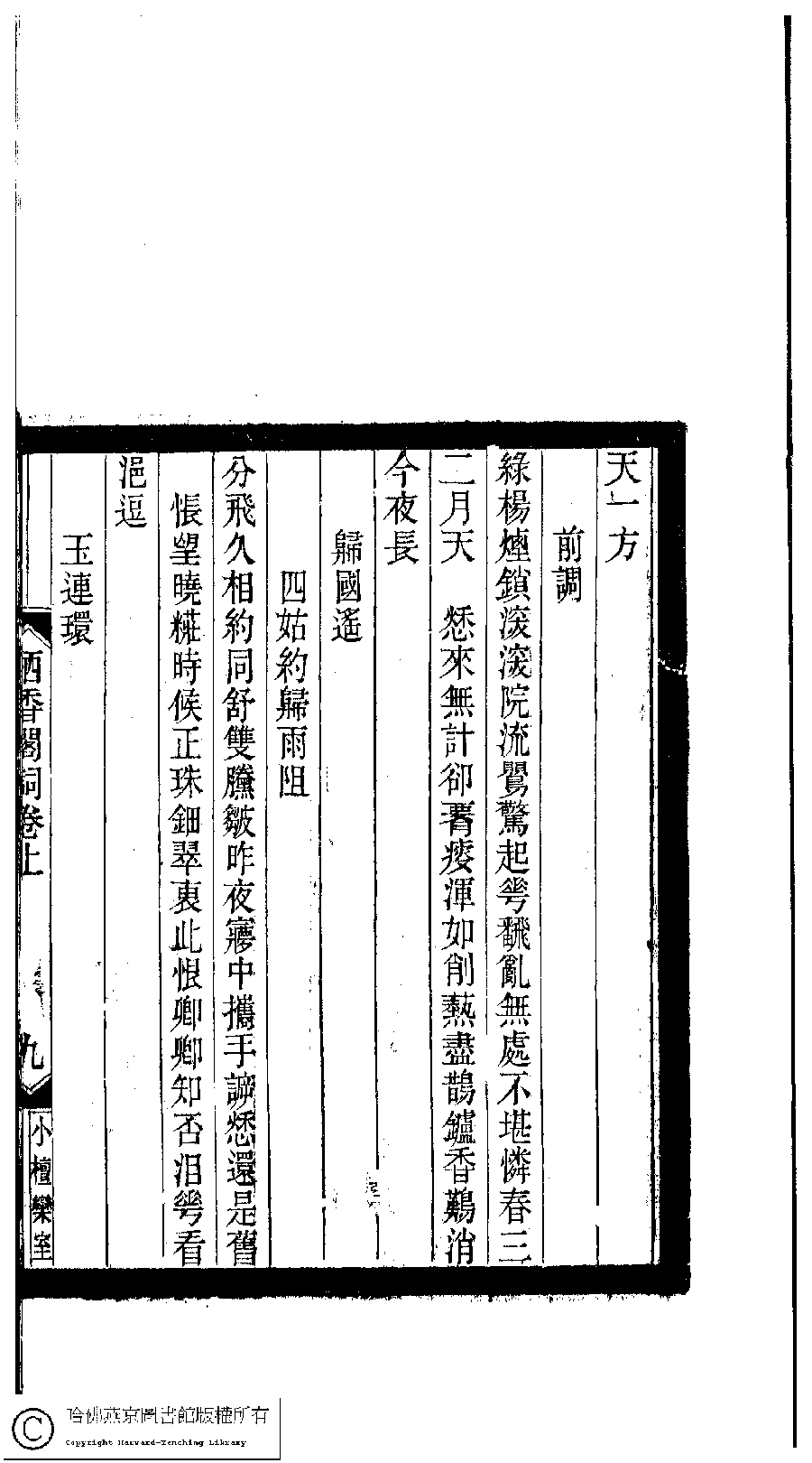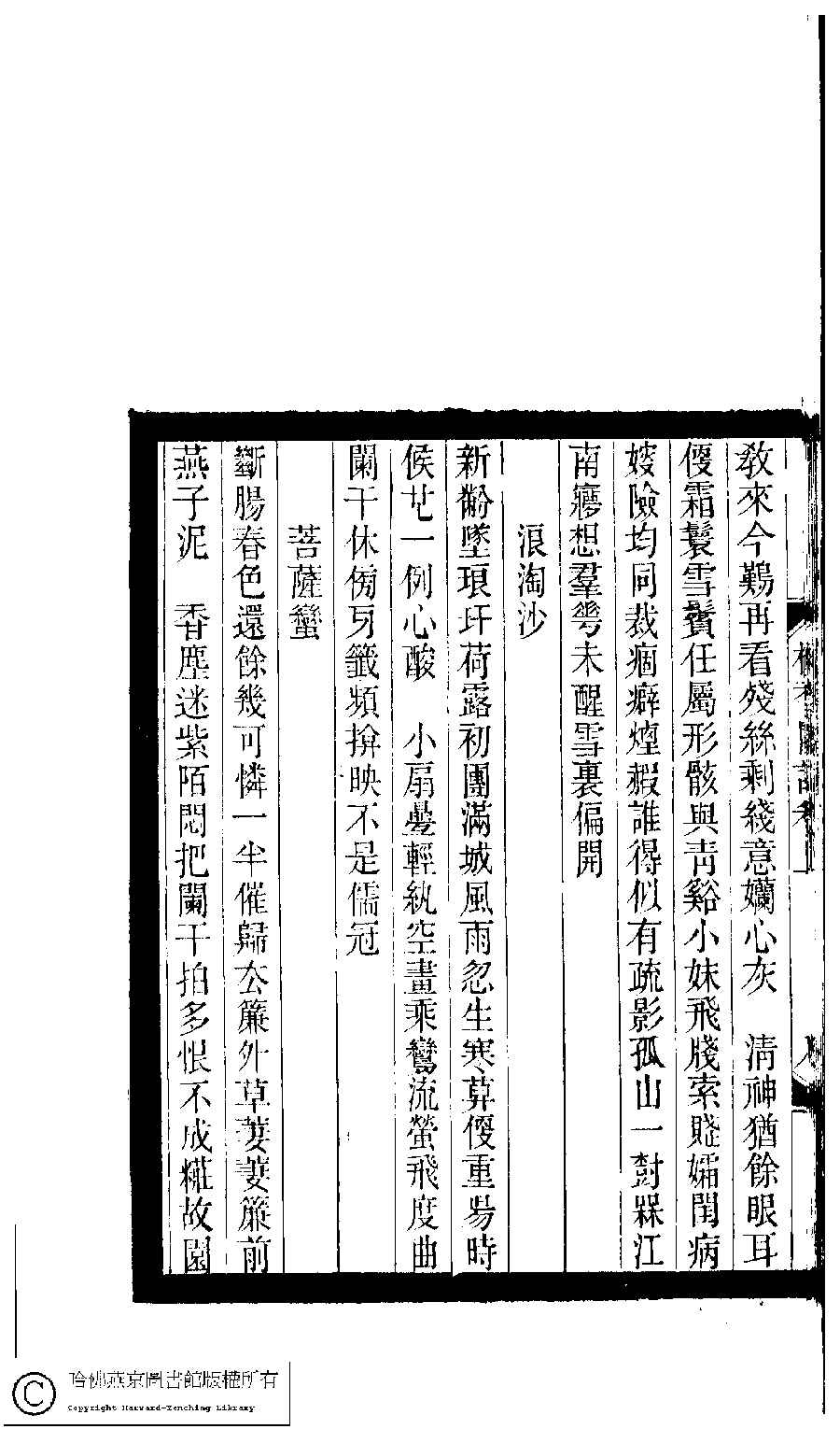 | (PRINT FRIENDLY VERSION) 小檀欒室彙刻閨秀詞﹕十集一百種一百卷(清徐乃昌輯) : 棲香閣詞﹕二卷。清光緒二十二年(1896)南陵徐氏刻本。 ![]() Page : 卷上.9a | click for larger image | 小檀欒室彙刻閨秀詞﹕十集一百種一百卷(清徐乃昌輯) : 棲香閣詞﹕二卷。清光緒二十二年(1896)南陵徐氏刻本。![]() Page : 卷上.8b | click for larger image | Back |