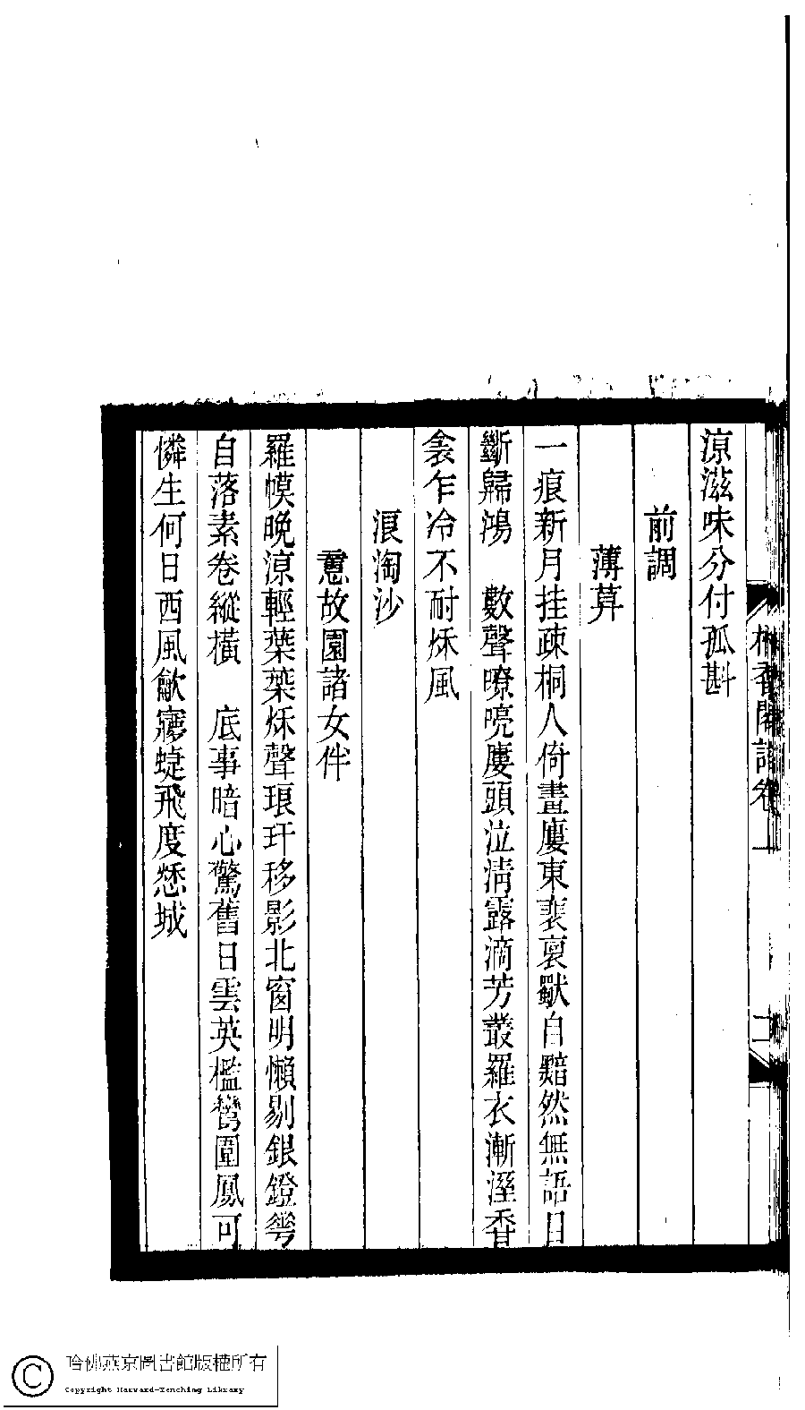 | (PRINT FRIENDLY VERSION) 小檀欒室彙刻閨秀詞﹕十集一百種一百卷(清徐乃昌輯) : 棲香閣詞﹕二卷。清光緒二十二年(1896)南陵徐氏刻本。 ![]() Page : 卷上.11b | click for larger image | 小檀欒室彙刻閨秀詞﹕十集一百種一百卷(清徐乃昌輯) : 棲香閣詞﹕二卷。清光緒二十二年(1896)南陵徐氏刻本。![]() Page : 卷上.11a | click for larger image | Back |