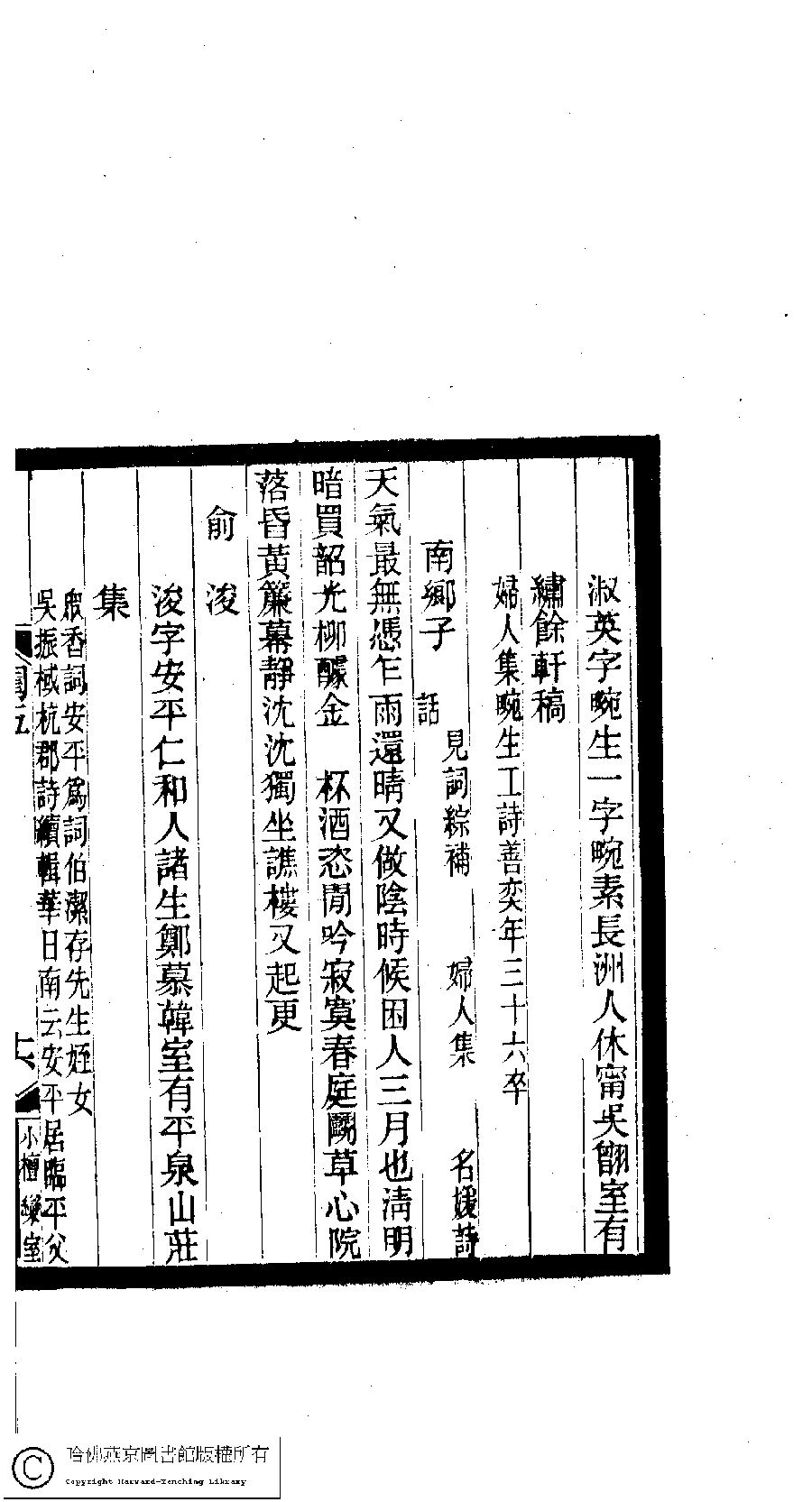 | (PRINT FRIENDLY VERSION) 閨秀詞鈔﹕十六卷(清徐乃昌輯)。清宣統元年(1909)小檀欒室刻本。 ![]() Page : 5.16b | click for larger image | 閨秀詞鈔﹕十六卷(清徐乃昌輯)。清宣統元年(1909)小檀欒室刻本。![]() Page : 5.16a | click for larger image | Back |