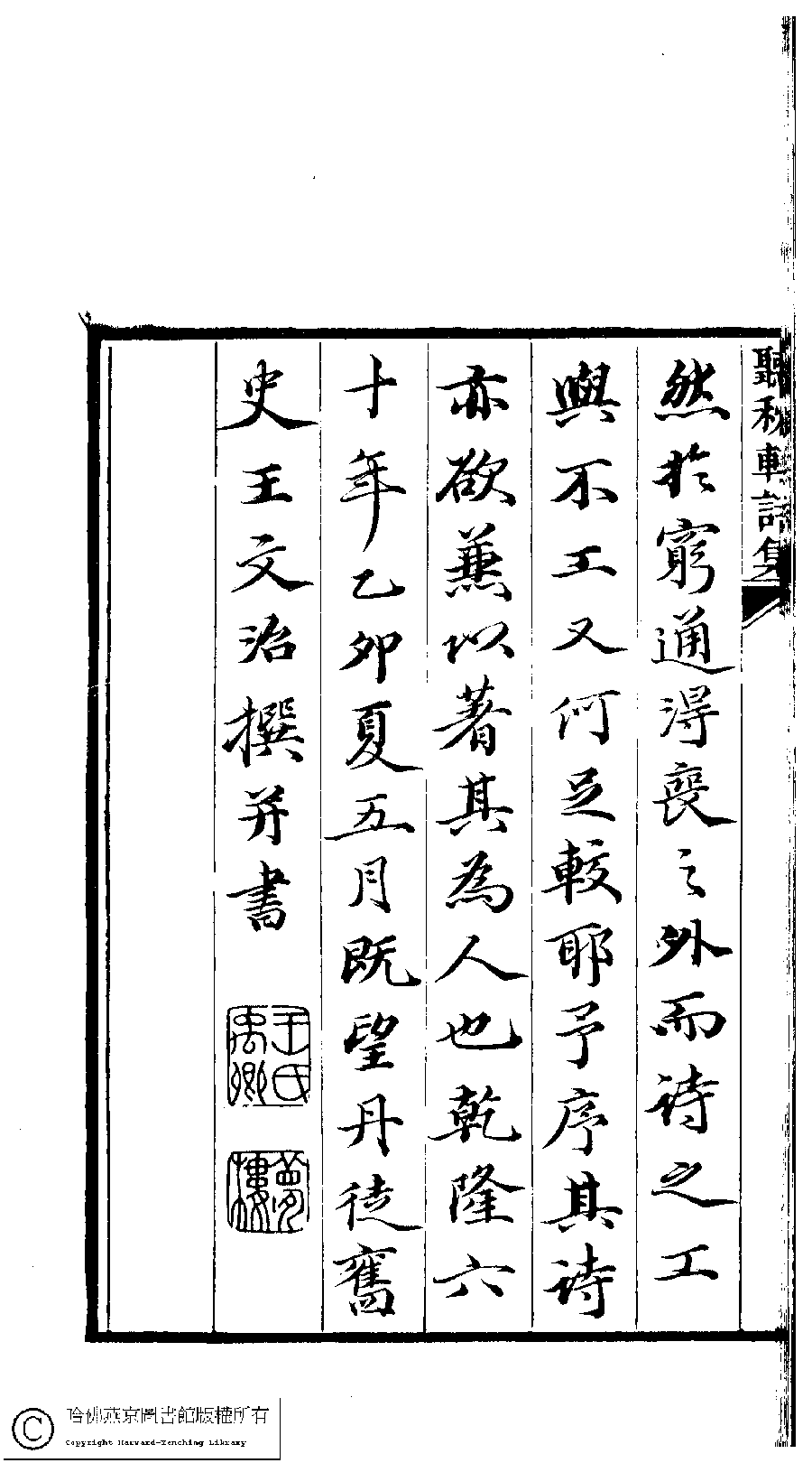 | (PRINT FRIENDLY VERSION) 聽秋軒詩集﹕三卷(清駱綺蘭撰) ![]() Page : 王序.2b | click for larger image | 聽秋軒詩集﹕三卷(清駱綺蘭撰)![]() Page : 王序.2a | click for larger image | 聽秋軒詩集﹕三卷(清駱綺蘭撰)![]() Page : 王序.1b | click for larger image | 聽秋軒詩集﹕三卷(清駱綺蘭撰)![]() Page : 王序.1a | click for larger image |