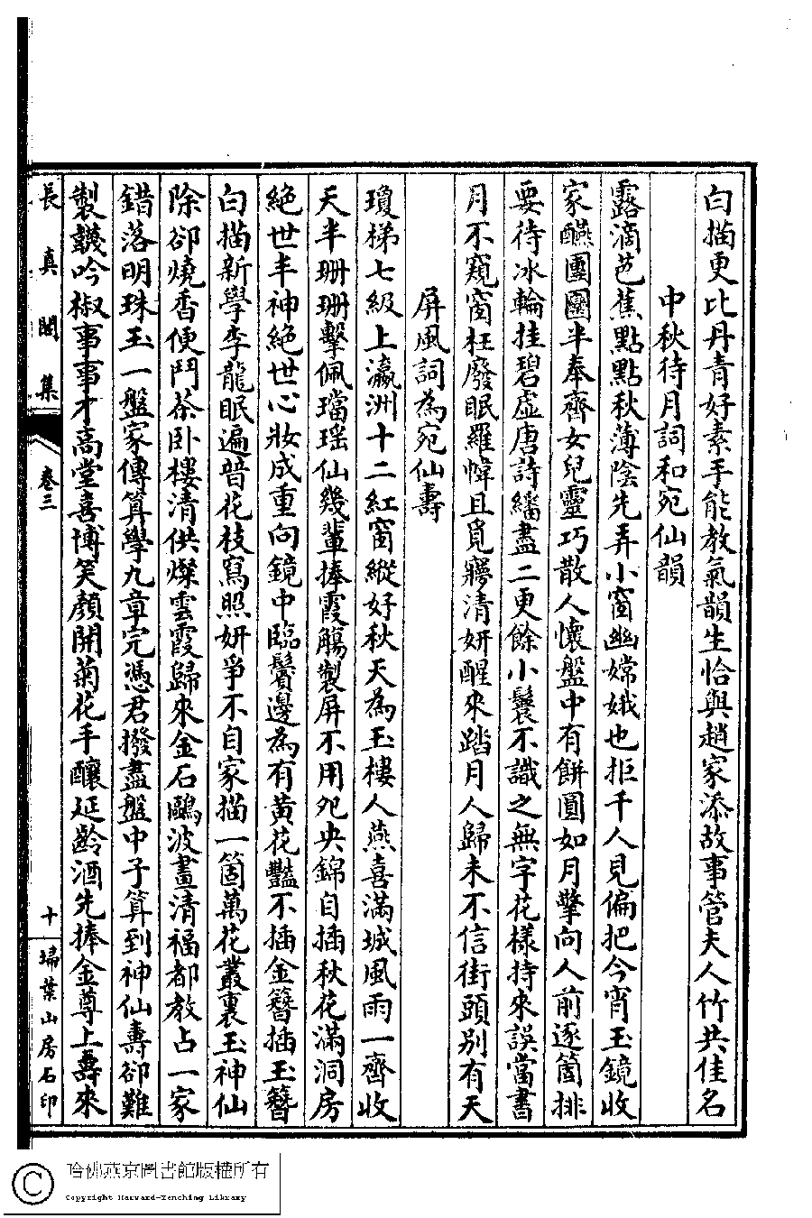 | (PRINT FRIENDLY VERSION) 長真閣集﹕七卷﹐詩餘﹕一卷(清席佩蘭撰)。民國九年(1920)掃葉山房石印本。 ![]() Page : 3.10a | click for larger image | 長真閣集﹕七卷﹐詩餘﹕一卷(清席佩蘭撰)。民國九年(1920)掃葉山房石印本。![]() Page : 3.9b | click for larger image | Back |
