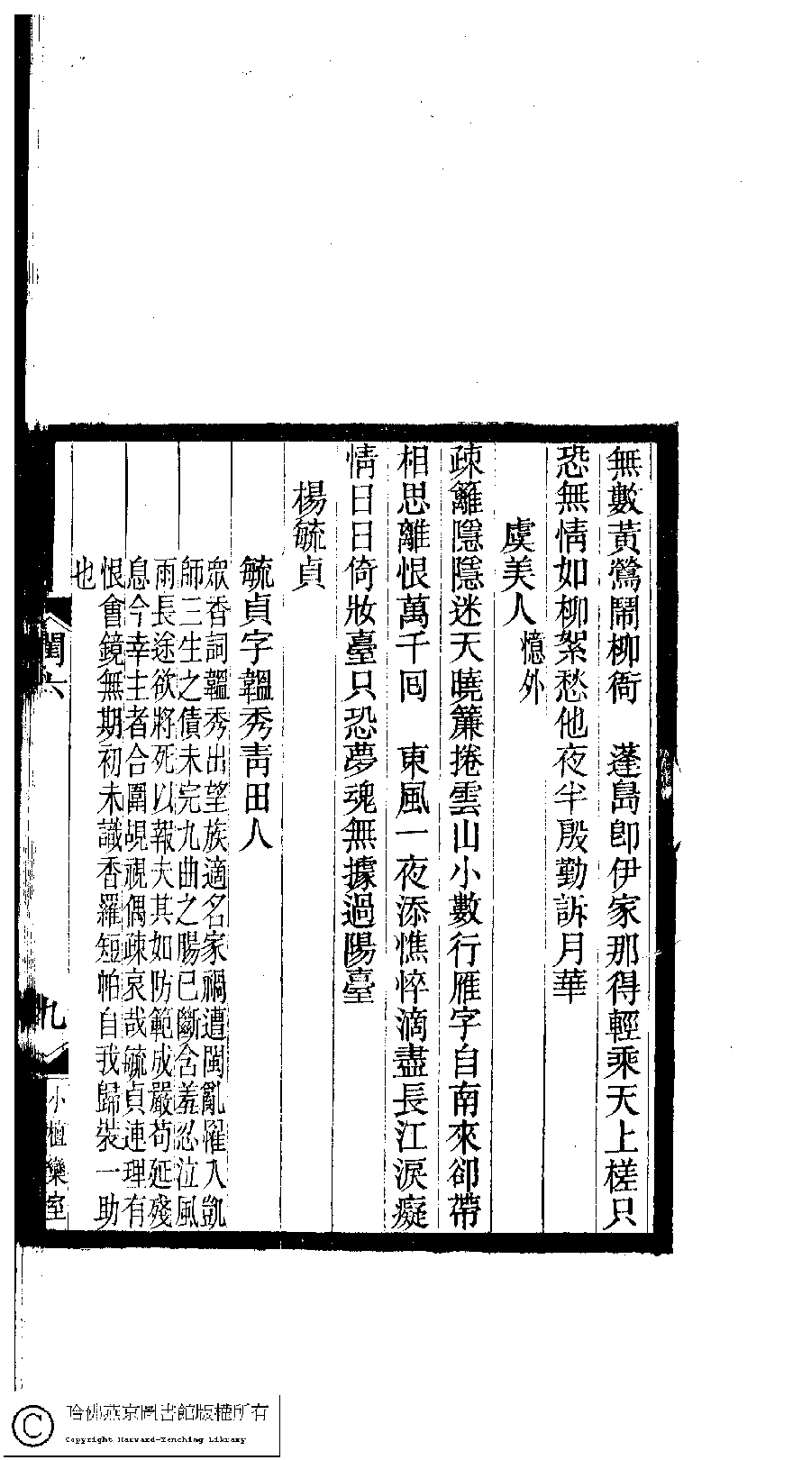 | (PRINT FRIENDLY VERSION) 閨秀詞鈔﹕十六卷(清徐乃昌輯)。清宣統元年(1909)小檀欒室刻本。 ![]() Page : 6.9a | click for larger image | Back |