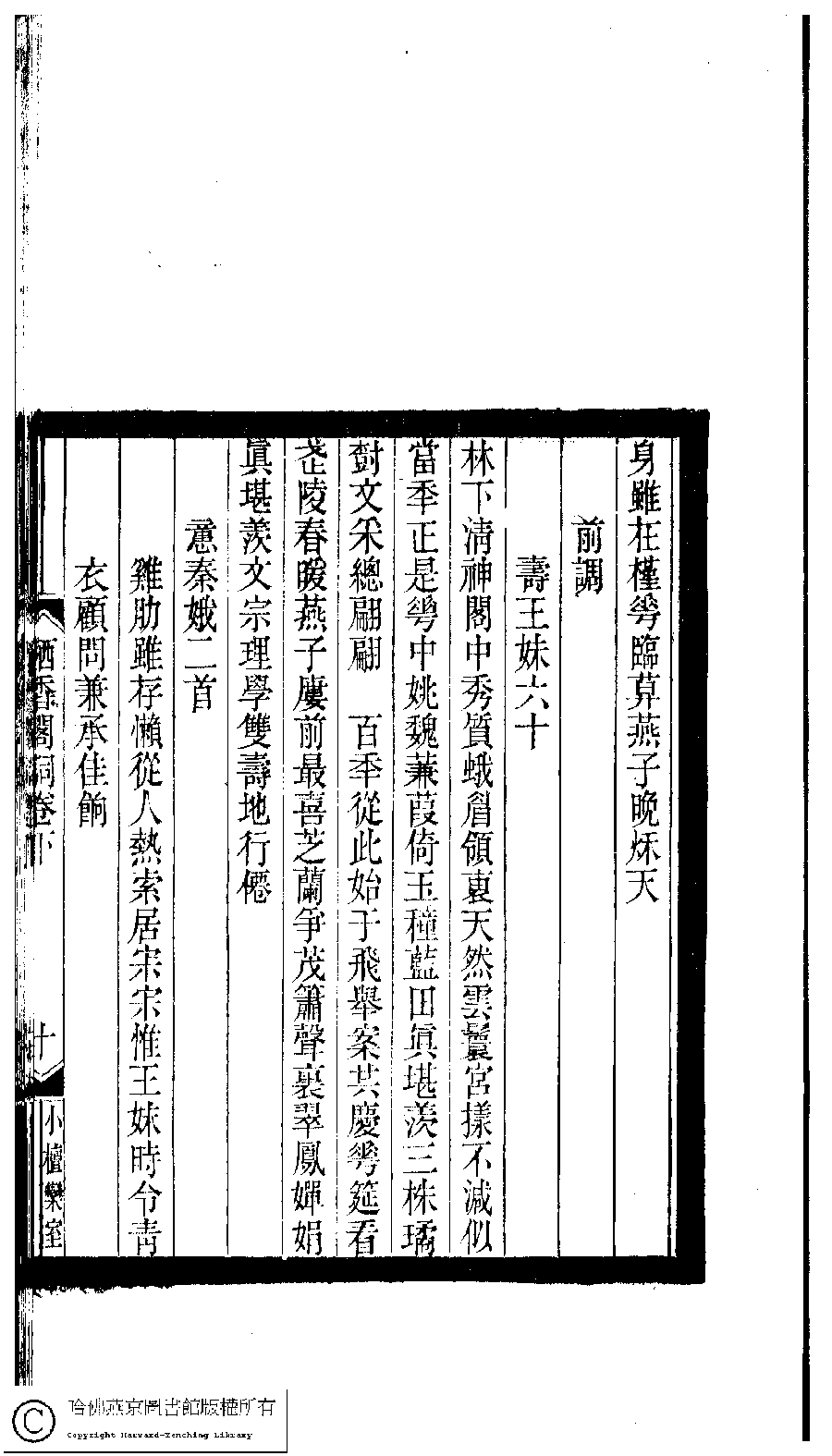 | (PRINT FRIENDLY VERSION) 小檀欒室彙刻閨秀詞﹕十集一百種一百卷(清徐乃昌輯) : 棲香閣詞﹕二卷。清光緒二十二年(1896)南陵徐氏刻本。 ![]() Page : 卷下.10a | click for larger image | 小檀欒室彙刻閨秀詞﹕十集一百種一百卷(清徐乃昌輯) : 棲香閣詞﹕二卷。清光緒二十二年(1896)南陵徐氏刻本。![]() Page : 卷下.9b | click for larger image | Back |