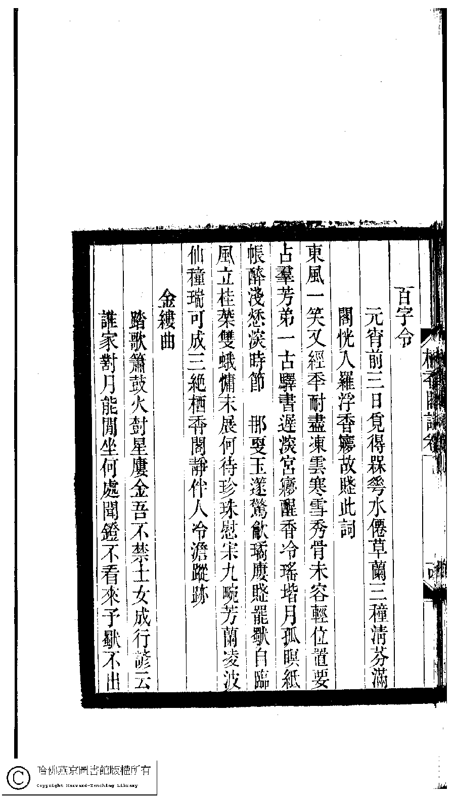Poem [Bai zi ling : Yuan xiao qian san ri mi de mei hua shui xian cao lan san zhong qing fen man ge huang ru luo fu xiang meng gu fu ci ci]