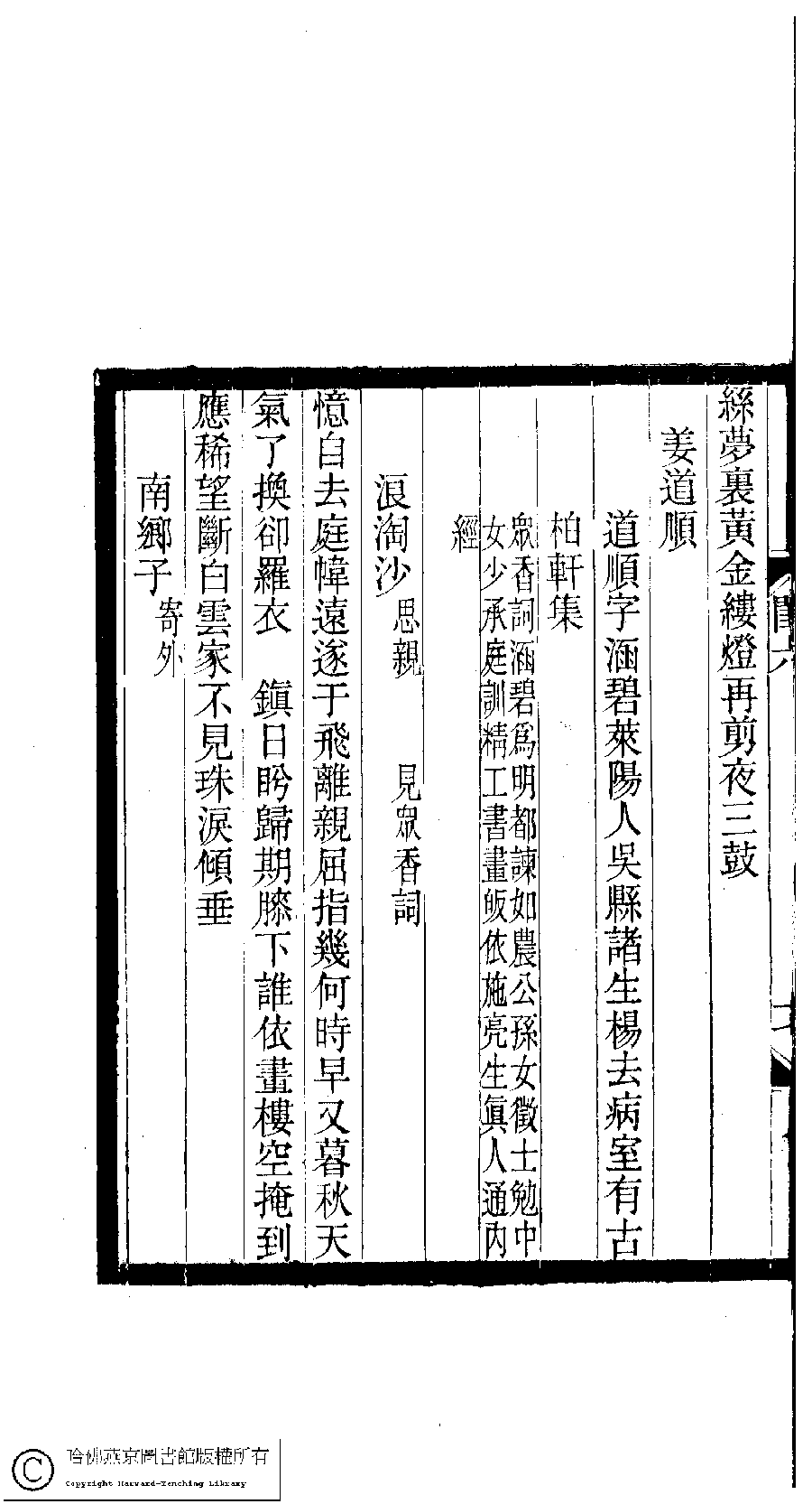 | (PRINT FRIENDLY VERSION) 閨秀詞鈔﹕十六卷(清徐乃昌輯)。清宣統元年(1909)小檀欒室刻本。 ![]() Page : 6.17b | click for larger image | 閨秀詞鈔﹕十六卷(清徐乃昌輯)。清宣統元年(1909)小檀欒室刻本。![]() Page : 6.17a | click for larger image | Back |