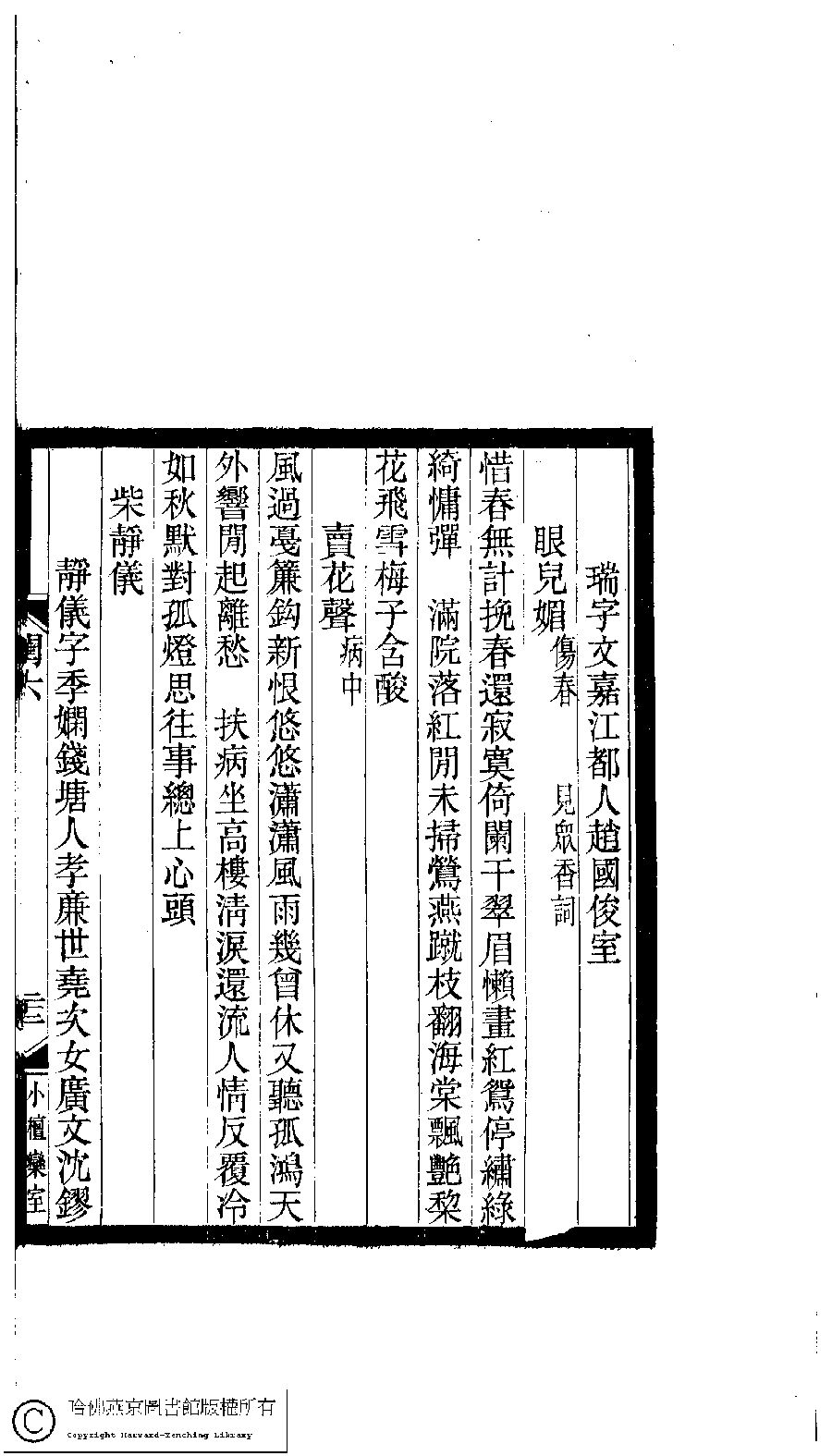 | (PRINT FRIENDLY VERSION) 閨秀詞鈔﹕十六卷(清徐乃昌輯)。清宣統元年(1909)小檀欒室刻本。 ![]() Page : 6.22a | click for larger image | 閨秀詞鈔﹕十六卷(清徐乃昌輯)。清宣統元年(1909)小檀欒室刻本。![]() Page : 6.21b | click for larger image | Back |