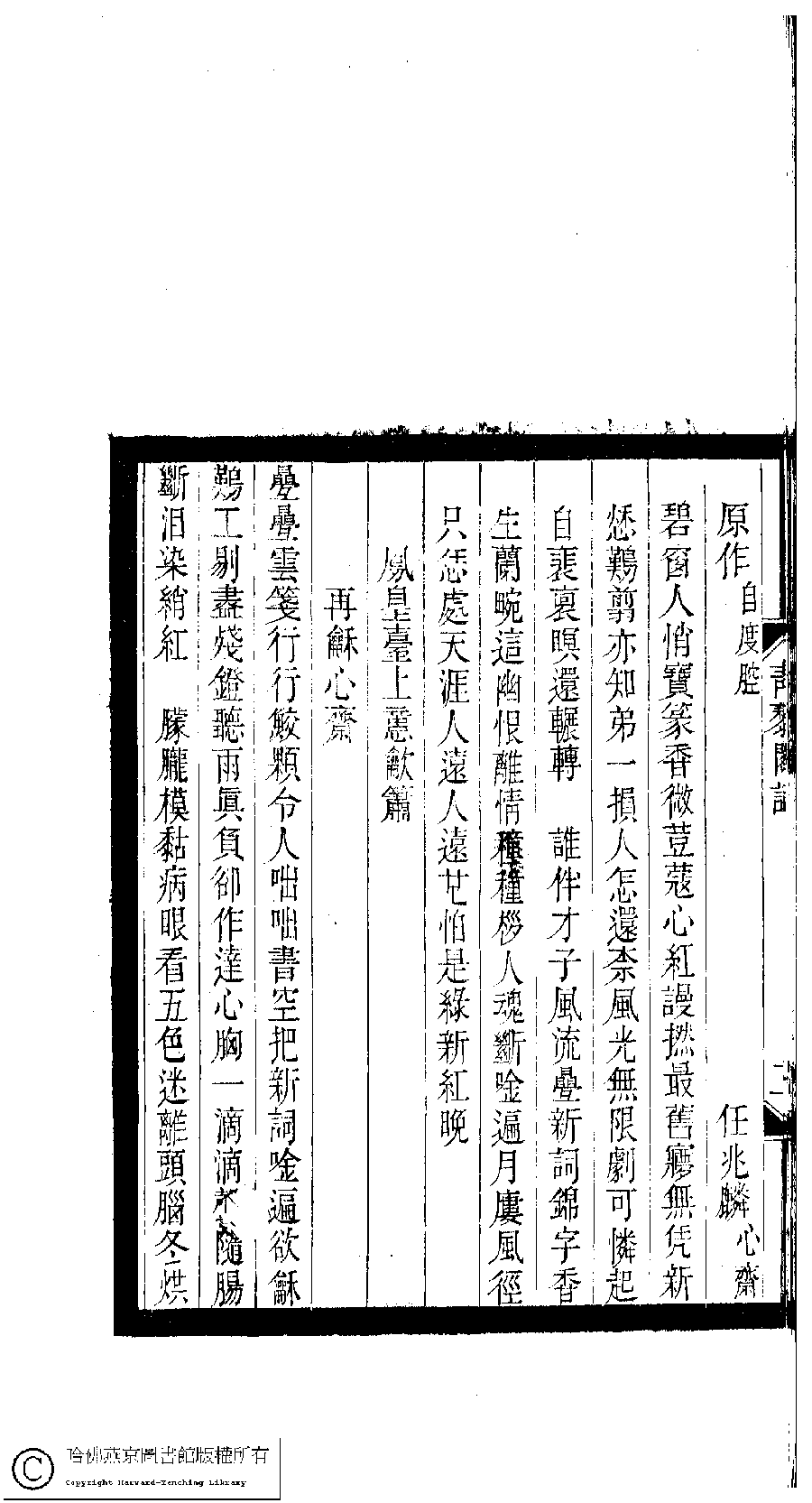 | (PRINT FRIENDLY VERSION) 小檀欒室彙刻閨秀詞﹕十集一百種一百卷(清徐乃昌輯) : 青藜閣詞﹕一卷。清光緒二十二年(1896)南陵徐氏刻本。 ![]() Page : 青藜閣詞.2b | click for larger image | 小檀欒室彙刻閨秀詞﹕十集一百種一百卷(清徐乃昌輯) : 青藜閣詞﹕一卷。清光緒二十二年(1896)南陵徐氏刻本。![]() Page : 青藜閣詞.2a | click for larger image | Back |