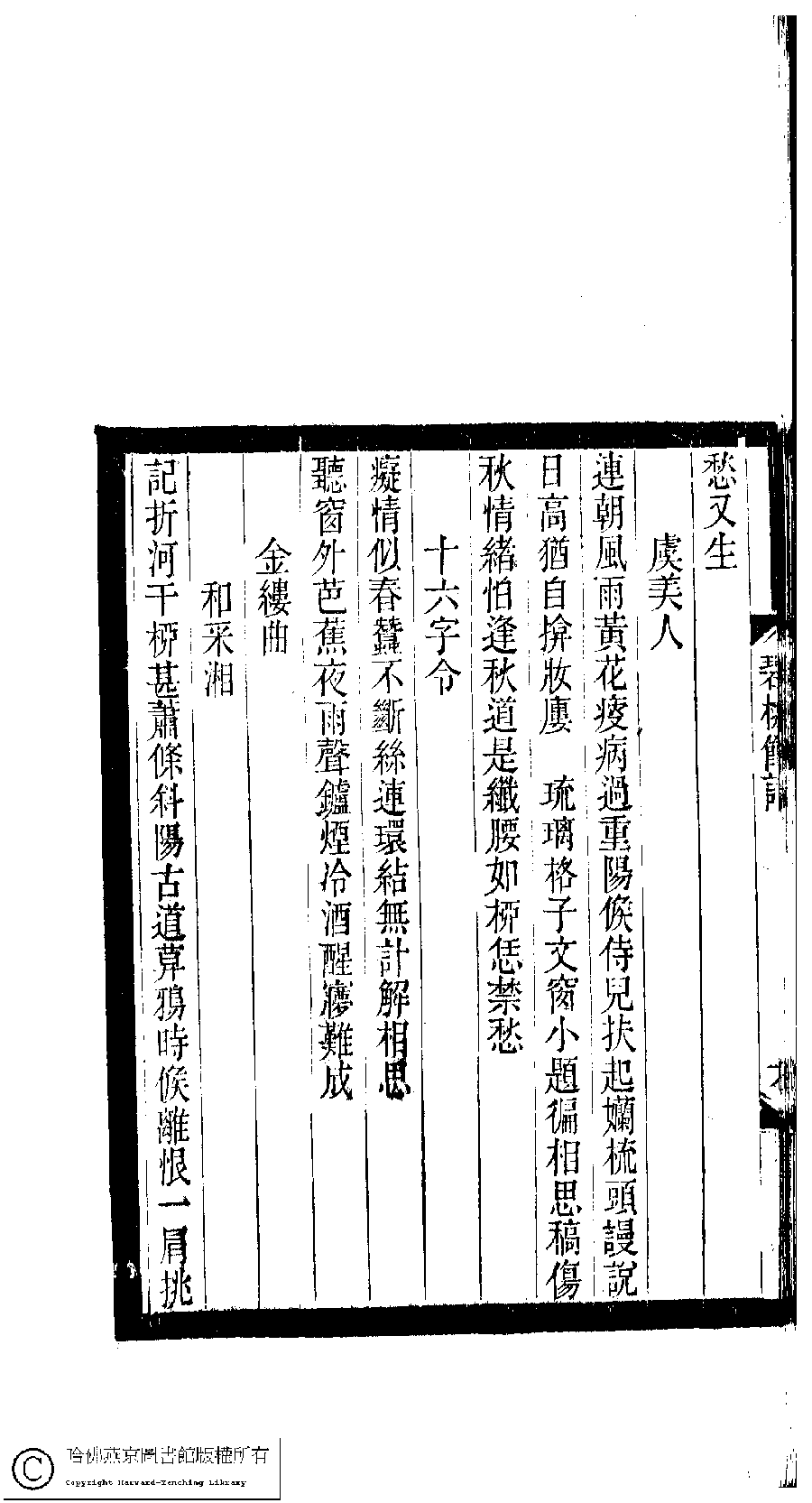 | Appears in: Xiao tan luan shi hui ke gui xiu ci: 10 ji 100 zhong 100 juan (edited by Xu Naichang, Qing dynasty): Bi tao guan ci: 1 juan |