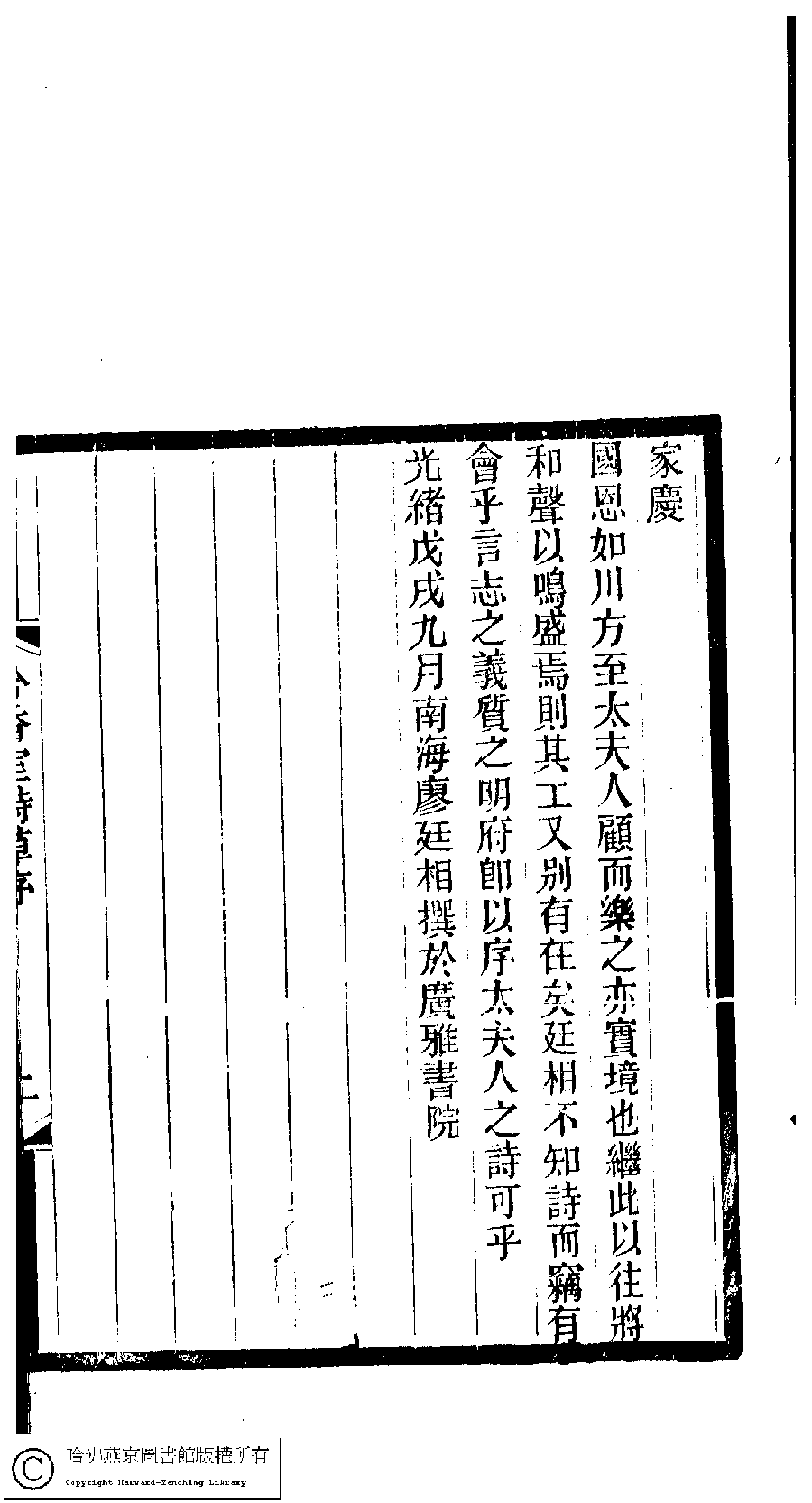 | (PRINT FRIENDLY VERSION) 吟香室詩草﹕二卷﹐續刻﹕一卷﹐附刻﹕一卷(清楊蘊輝撰)。清光緒二十三年(1897)刻本。 ![]() Page : 序.3, 2b | click for larger image | 吟香室詩草﹕二卷﹐續刻﹕一卷﹐附刻﹕一卷(清楊蘊輝撰)。清光緒二十三年(1897)刻本。![]() Page : 序.3, 2a | click for larger image | 吟香室詩草﹕二卷﹐續刻﹕一卷﹐附刻﹕一卷(清楊蘊輝撰)。清光緒二十三年(1897)刻本。![]() Page : 序.3, 1b | click for larger image | 吟香室詩草﹕二卷﹐續刻﹕一卷﹐附刻﹕一卷(清楊蘊輝撰)。清光緒二十三年(1897)刻本。![]() Page : 序.3, 1a | click for larger image | Back |