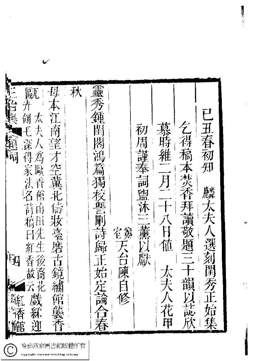 Poem [Ji chou chun chu zhi Lin tai fu ren xuan ke Gui xiu zheng shi ji qi de gao ben fen xiang bai du jing ti san shi yun yi zhi xin mu shi wei er yue er shi ba ri zhi tai fu ren hua jia chu zhou jin feng ci guan mu san xun yi xian]