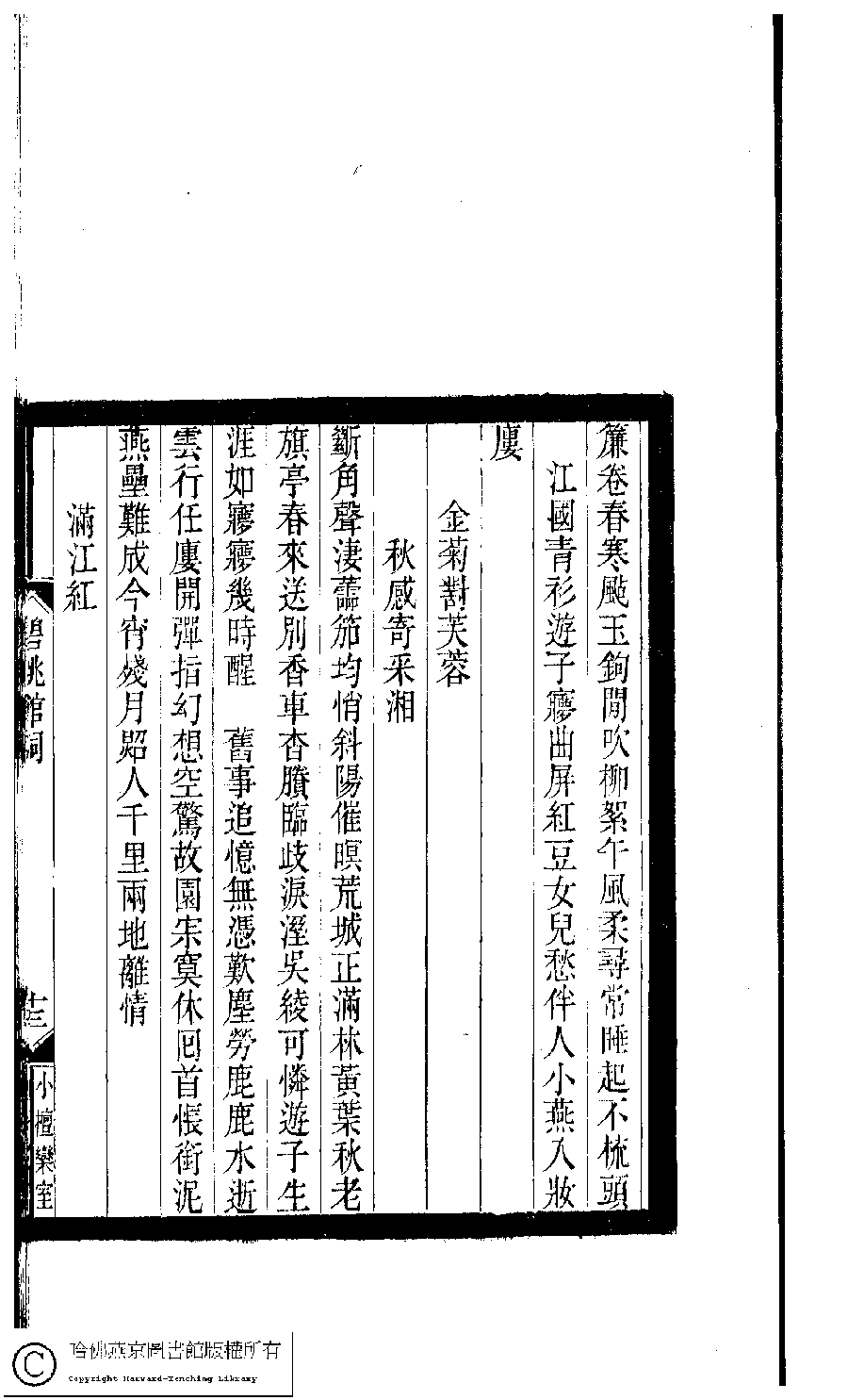 | (PRINT FRIENDLY VERSION) 小檀欒室彙刻閨秀詞﹕十集一百種一百卷(清徐乃昌輯) : 碧桃館詞﹕一卷。清光緒二十二年(1896)南陵徐氏刻本。 ![]() Page : 碧桃館詞.13b | click for larger image | 小檀欒室彙刻閨秀詞﹕十集一百種一百卷(清徐乃昌輯) : 碧桃館詞﹕一卷。清光緒二十二年(1896)南陵徐氏刻本。![]() Page : 碧桃館詞.13a | click for larger image | Back |