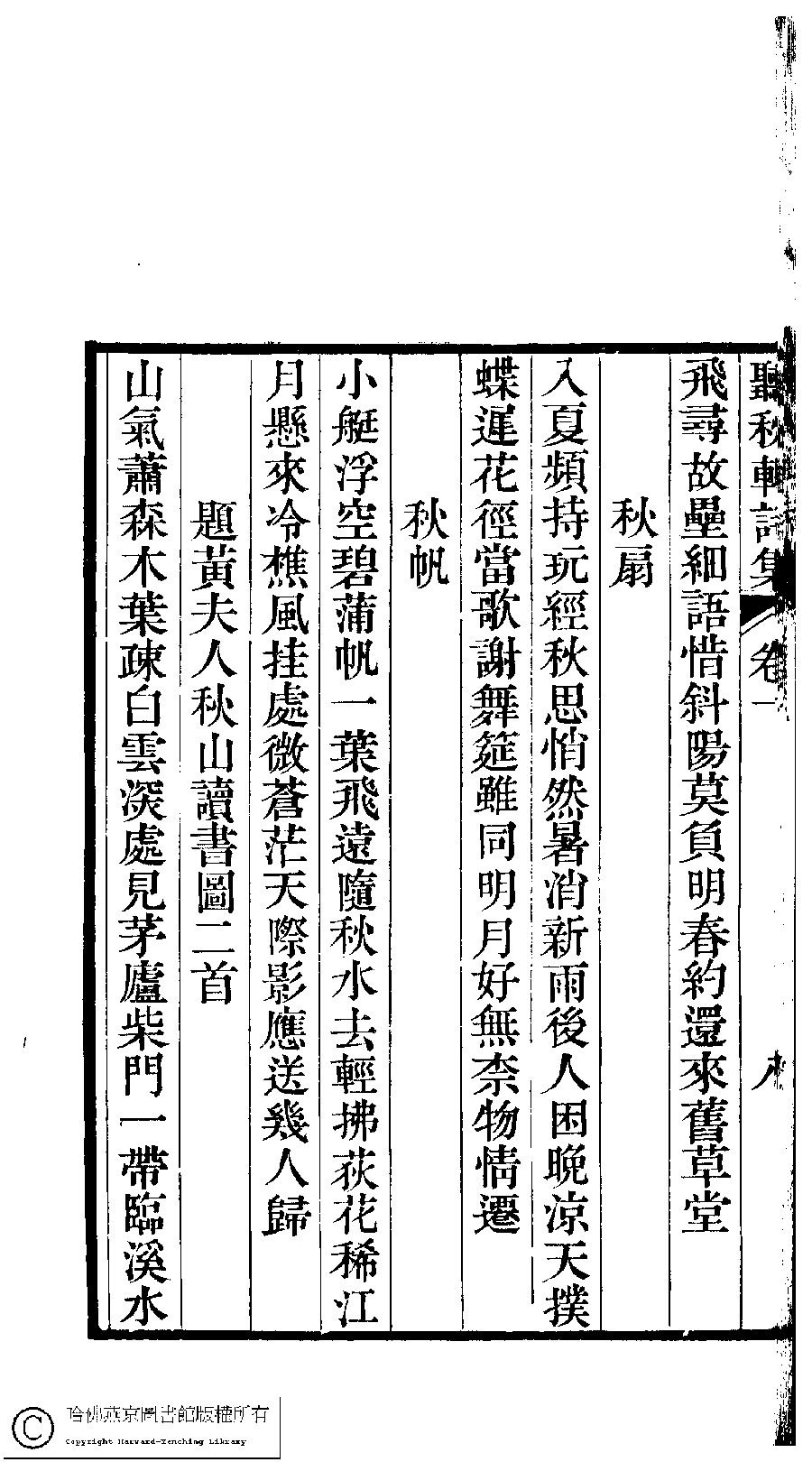 | (PRINT FRIENDLY VERSION) 聽秋軒詩集﹕三卷(清駱綺蘭撰)。清乾隆六十年(1795)金陵龔氏刻本。 ![]() Page : 1.9a | click for larger image | 聽秋軒詩集﹕三卷(清駱綺蘭撰)。清乾隆六十年(1795)金陵龔氏刻本。![]() Page : 1.8b | click for larger image | Back |