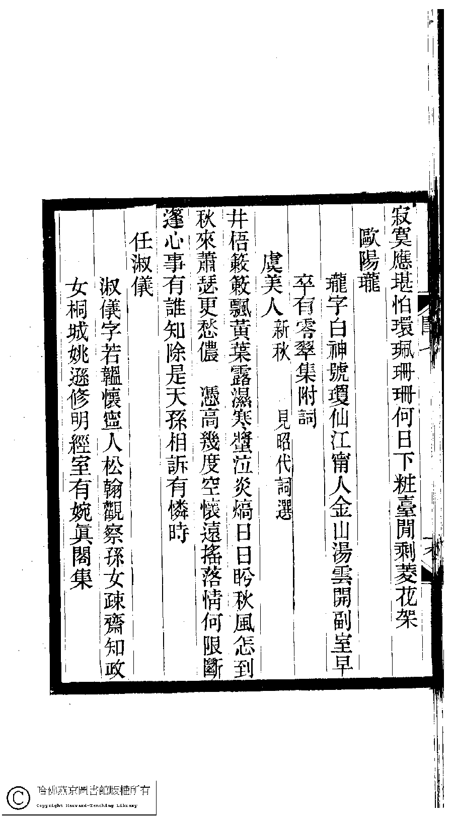 | (PRINT FRIENDLY VERSION) 閨秀詞鈔﹕十六卷(清徐乃昌輯)。清宣統元年(1909)小檀欒室刻本。 ![]() Page : 7.19b | click for larger image | Back |