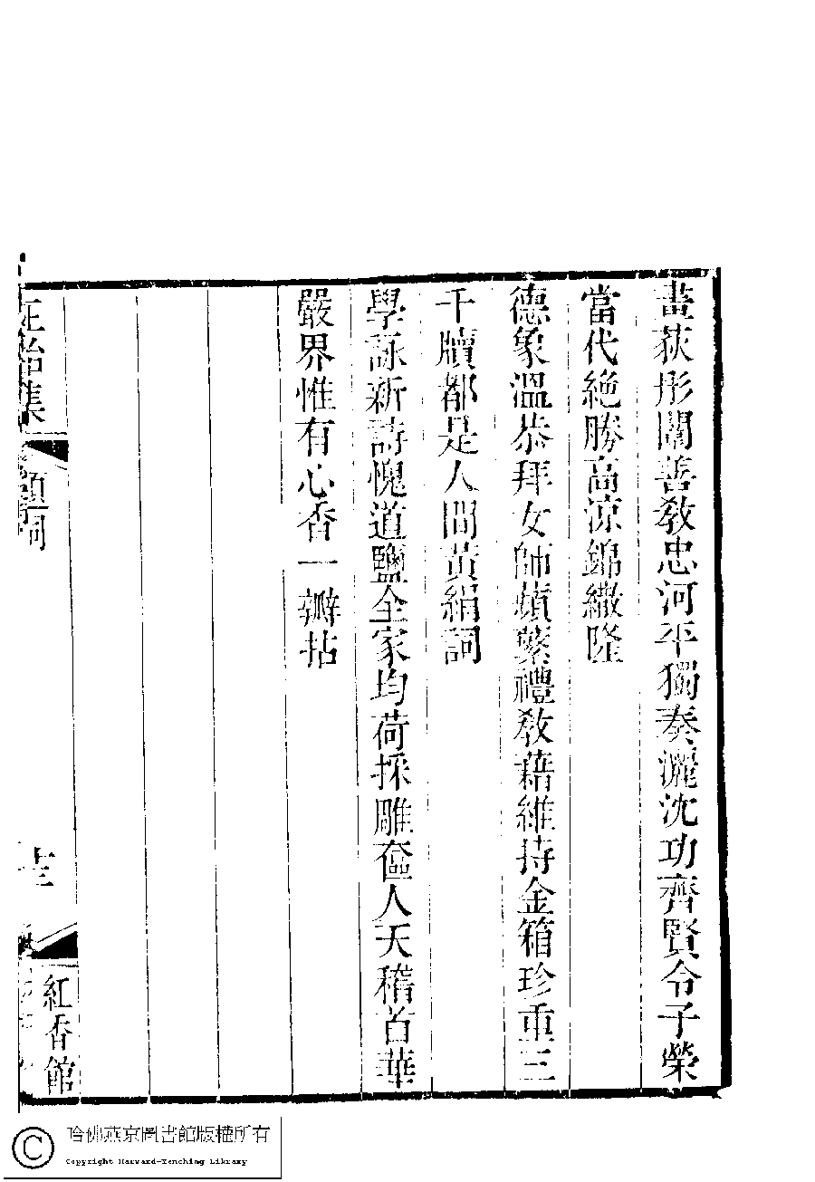 | (PRINT FRIENDLY VERSION) 國朝閨秀正始集﹕二十卷﹐附錄﹕一卷﹐補遺﹕一卷﹐又附題詞﹕一卷(清惲珠輯)。清道光十一年(1831)紅香館刻本。 ![]() Page : 題辭.13b | click for larger image | 國朝閨秀正始集﹕二十卷﹐附錄﹕一卷﹐補遺﹕一卷﹐又附題詞﹕一卷(清惲珠輯)。清道光十一年(1831)紅香館刻本。![]() Page : 題辭.13a | click for larger image | 國朝閨秀正始集﹕二十卷﹐附錄﹕一卷﹐補遺﹕一卷﹐又附題詞﹕一卷(清惲珠輯)。清道光十一年(1831)紅香館刻本。![]() Page : 題辭.12b | click for larger image | 國朝閨秀正始集﹕二十卷﹐附錄﹕一卷﹐補遺﹕一卷﹐又附題詞﹕一卷(清惲珠輯)。清道光十一年(1831)紅香館刻本。![]() Page : 題辭.12a | click for larger image | Back |
