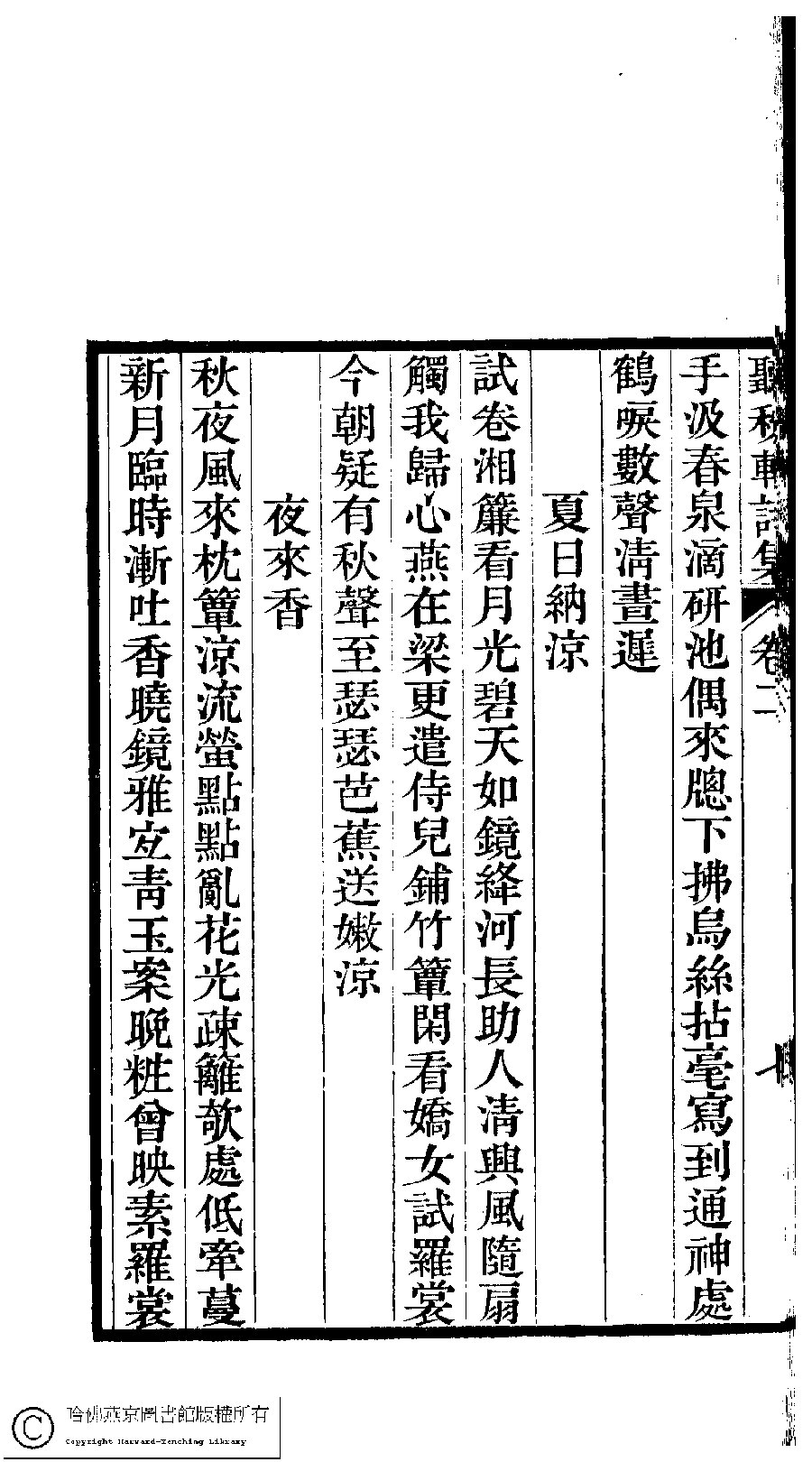 | (PRINT FRIENDLY VERSION) 聽秋軒詩集﹕三卷(清駱綺蘭撰)。清乾隆六十年(1795)金陵龔氏刻本。 ![]() Page : 2.7b | click for larger image | Back |