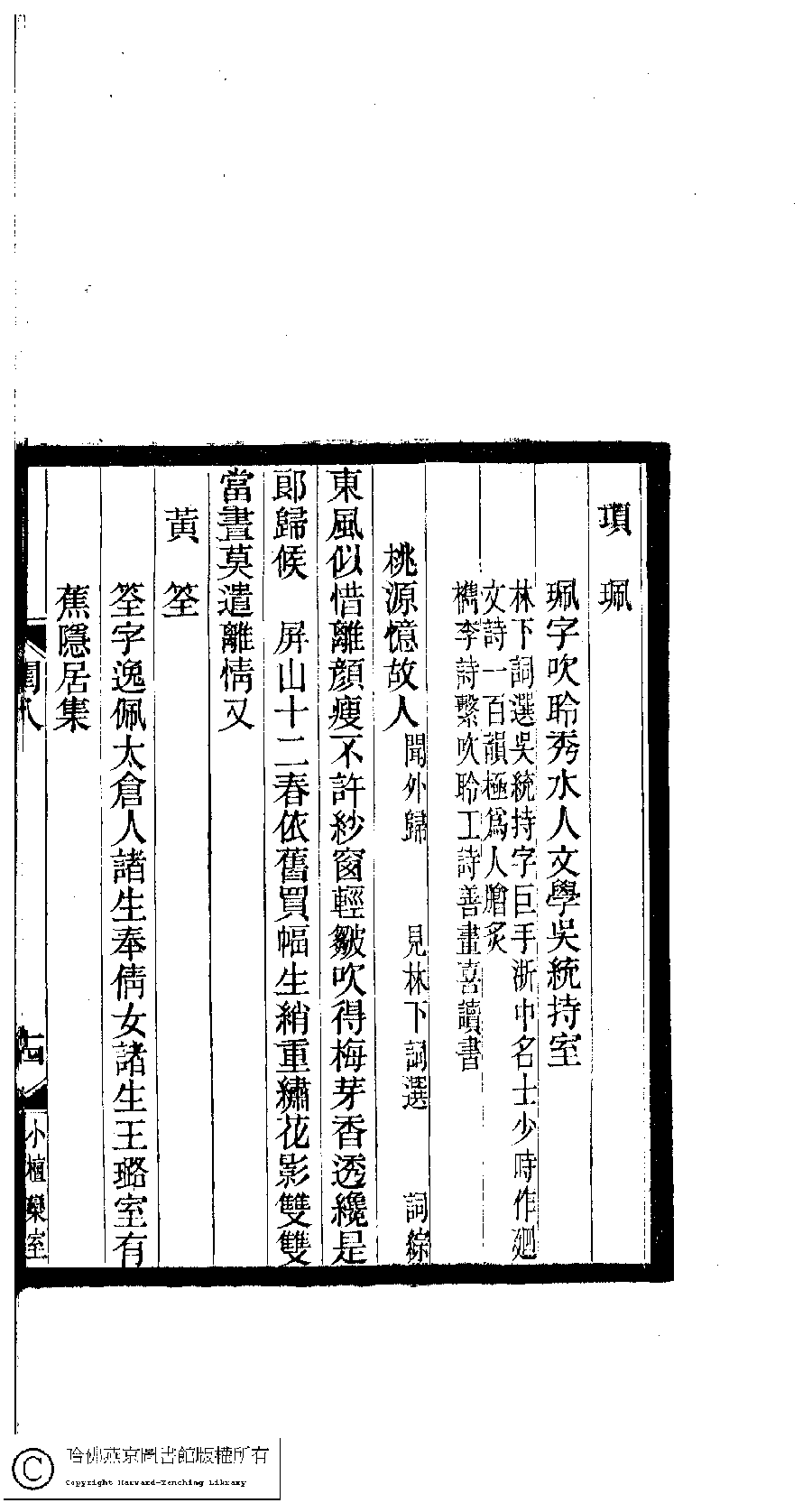 | (PRINT FRIENDLY VERSION) 閨秀詞鈔﹕十六卷(清徐乃昌輯)。清宣統元年(1909)小檀欒室刻本。 ![]() Page : 8.14a | click for larger image | Back |