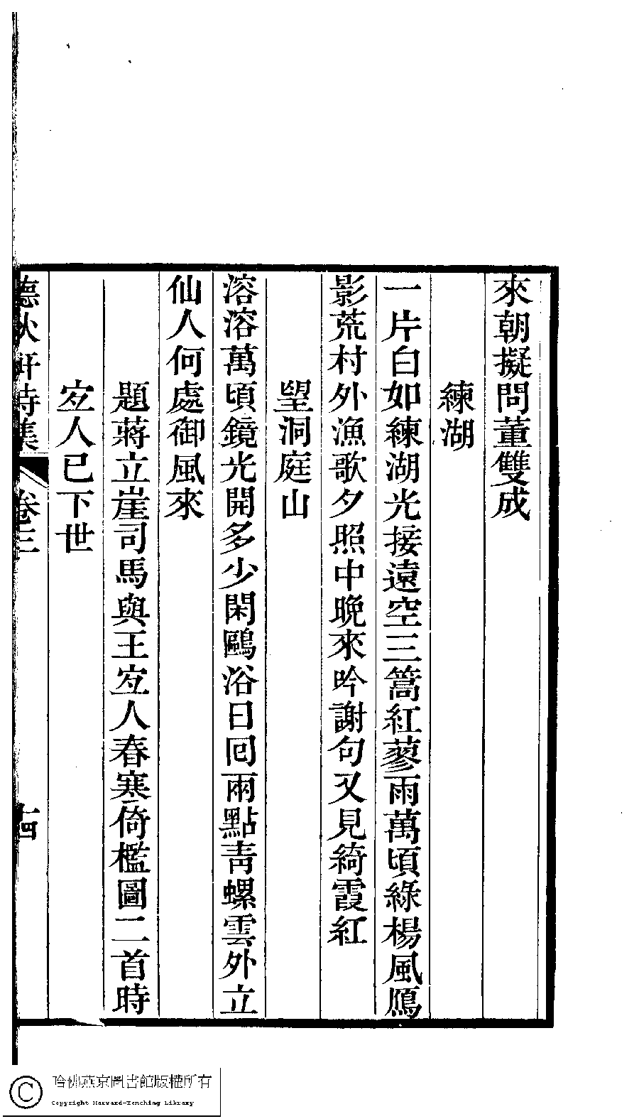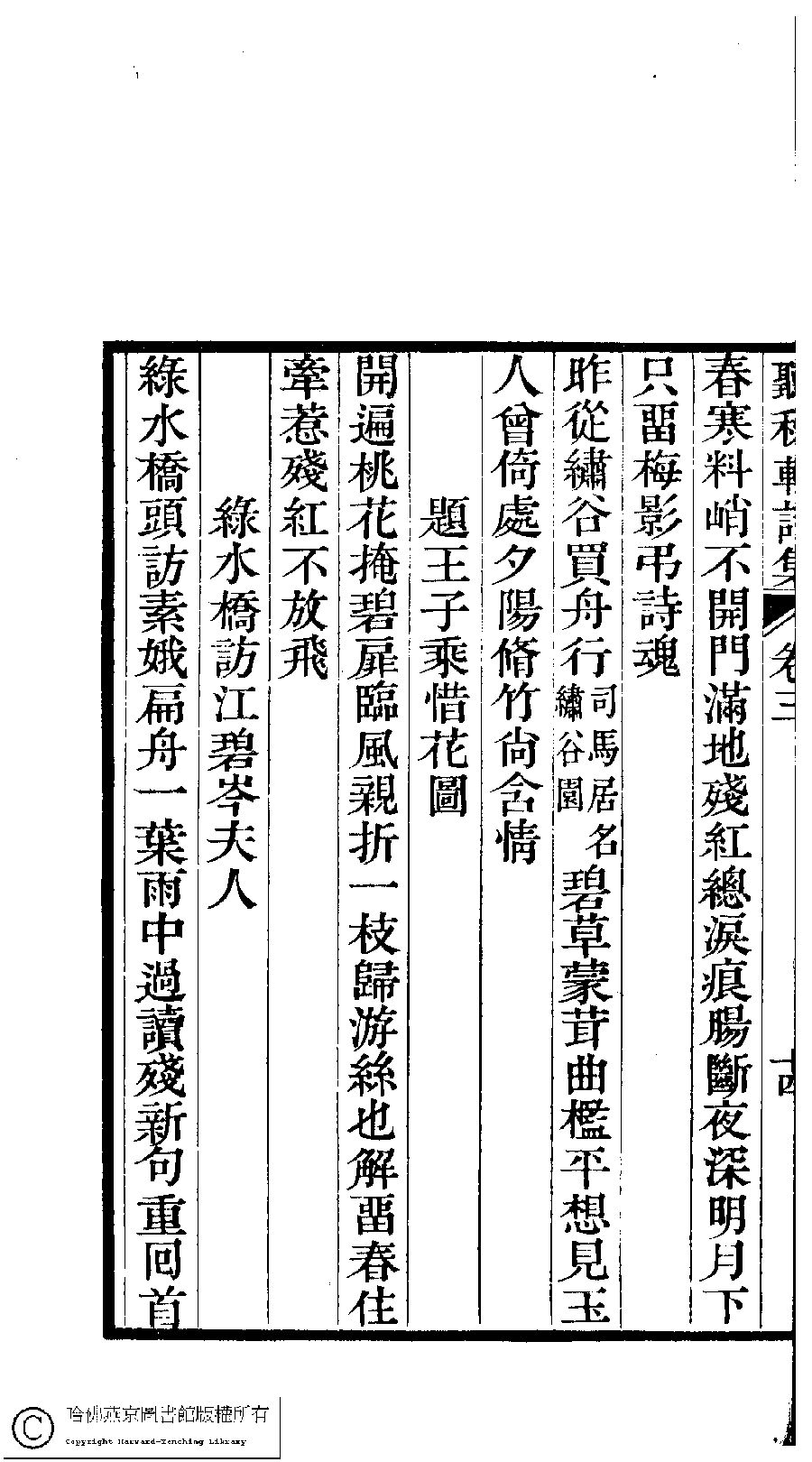 | (PRINT FRIENDLY VERSION) 聽秋軒詩集﹕三卷(清駱綺蘭撰)。清乾隆六十年(1795)金陵龔氏刻本。 ![]() Page : 3.14b | click for larger image | 聽秋軒詩集﹕三卷(清駱綺蘭撰)。清乾隆六十年(1795)金陵龔氏刻本。![]() Page : 3.14a | click for larger image | Back |