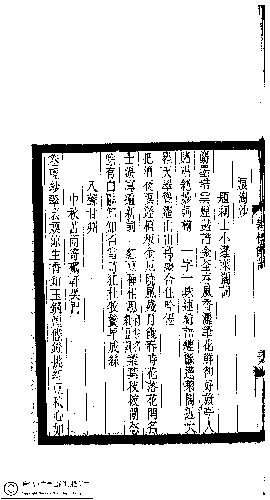 | (PRINT FRIENDLY VERSION) 小檀欒室彙刻閨秀詞﹕十集一百種一百卷(清徐乃昌輯) : 碧桃館詞﹕一卷。清光緒二十二年(1896)南陵徐氏刻本。 ![]() Page : 碧桃館詞 .39b | click for larger image | Back |