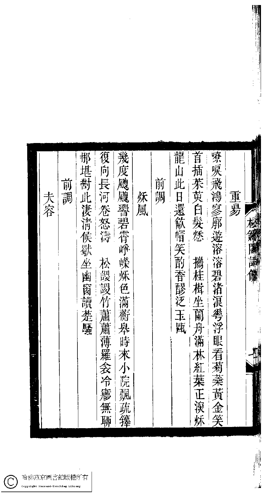 | (PRINT FRIENDLY VERSION) 小檀欒室彙刻閨秀詞﹕十集一百種一百卷(清徐乃昌輯) : 松籟閣詩餘﹕一卷。清光緒二十二年(1896)南陵徐氏刻本。 ![]() Page : 松籟閣詩餘.7b | click for larger image | Back |