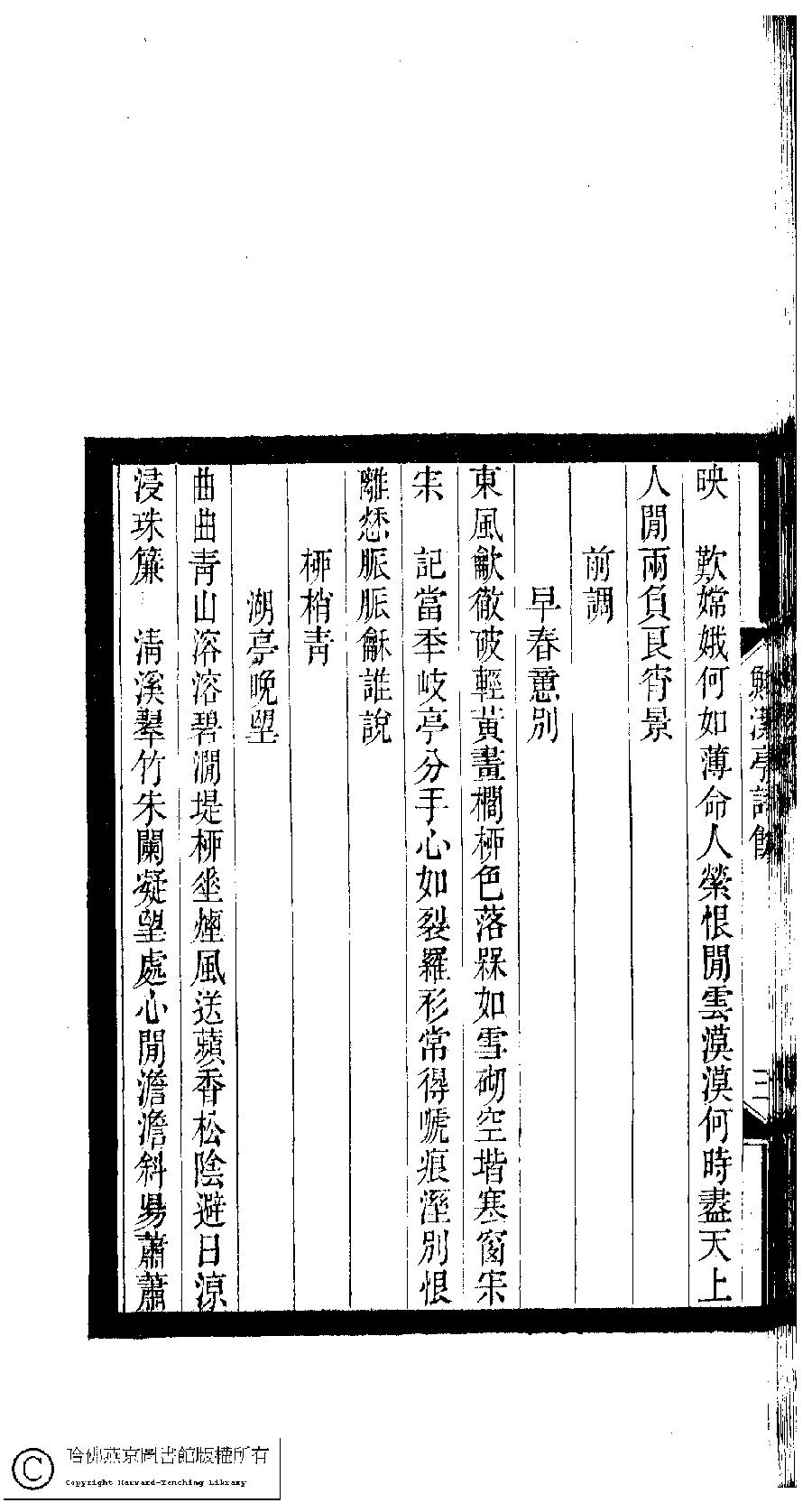 | (PRINT FRIENDLY VERSION) 小檀欒室彙刻閨秀詞﹕十集一百種一百卷(清徐乃昌輯) : 鮮潔亭詩餘﹕一卷。清光緒二十二年(1896)南陵徐氏刻本。 ![]() Page : 鮮潔亭詩餘.3b | click for larger image | 小檀欒室彙刻閨秀詞﹕十集一百種一百卷(清徐乃昌輯) : 鮮潔亭詩餘﹕一卷。清光緒二十二年(1896)南陵徐氏刻本。![]() Page : 鮮潔亭詩餘.3a | click for larger image | Back |