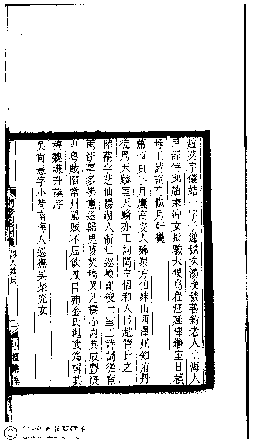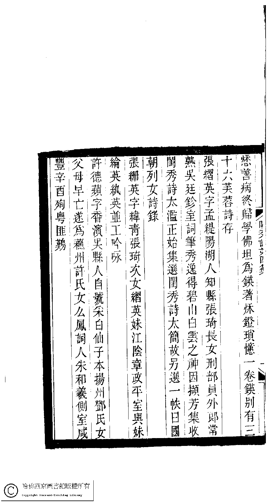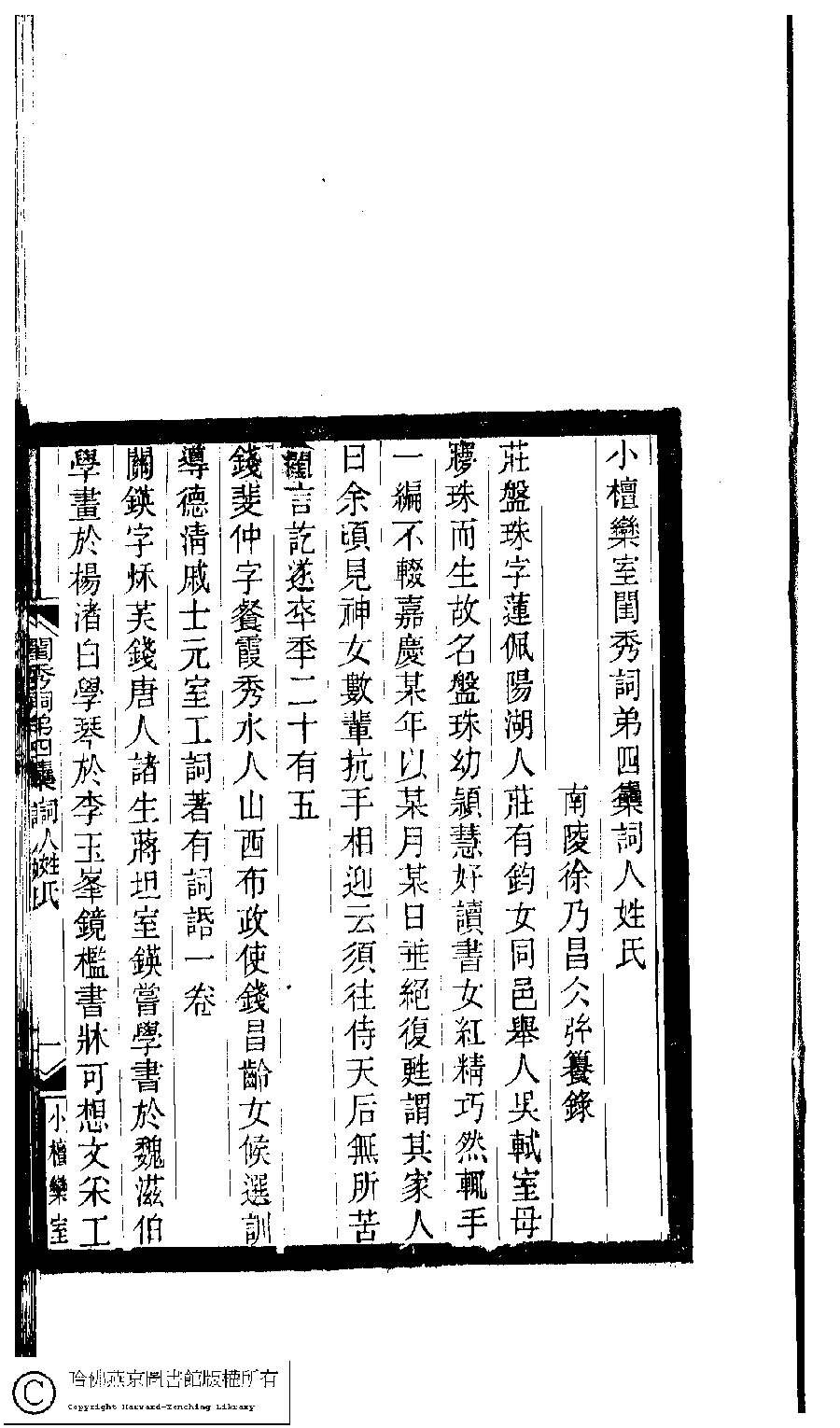 | (PRINT FRIENDLY VERSION) 小檀欒室彙刻閨秀詞﹕十集一百種一百卷(清徐乃昌輯)。清光緒二十二年(1896)南陵徐氏刻本。 ![]() Page : 姓氏.2b | click for larger image | 小檀欒室彙刻閨秀詞﹕十集一百種一百卷(清徐乃昌輯)。清光緒二十二年(1896)南陵徐氏刻本。![]() Page : 姓氏.2a | click for larger image | 小檀欒室彙刻閨秀詞﹕十集一百種一百卷(清徐乃昌輯)。清光緒二十二年(1896)南陵徐氏刻本。![]() Page : 姓氏.1b | click for larger image | 小檀欒室彙刻閨秀詞﹕十集一百種一百卷(清徐乃昌輯)。清光緒二十二年(1896)南陵徐氏刻本。![]() Page : 姓氏.1a | click for larger image | Back |