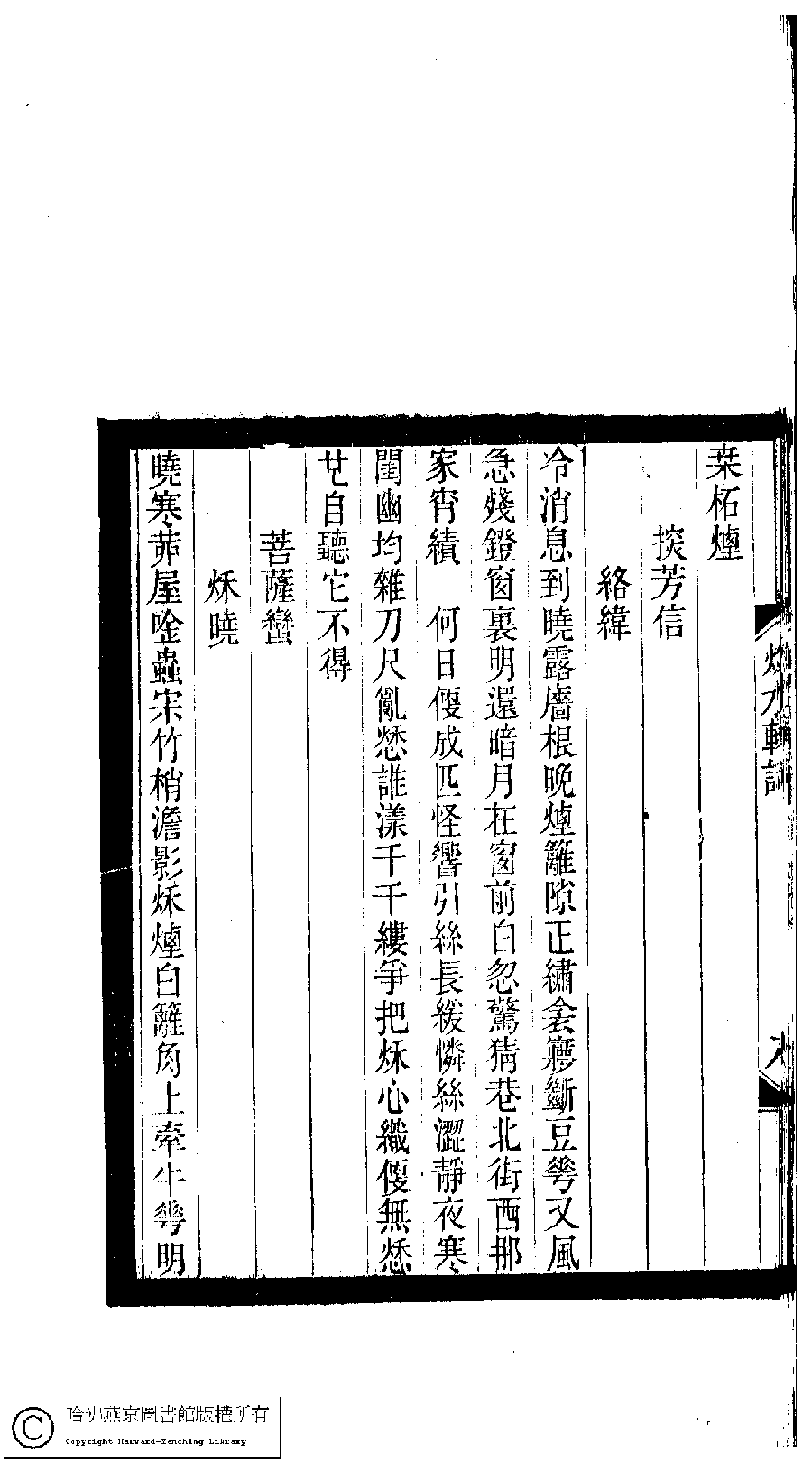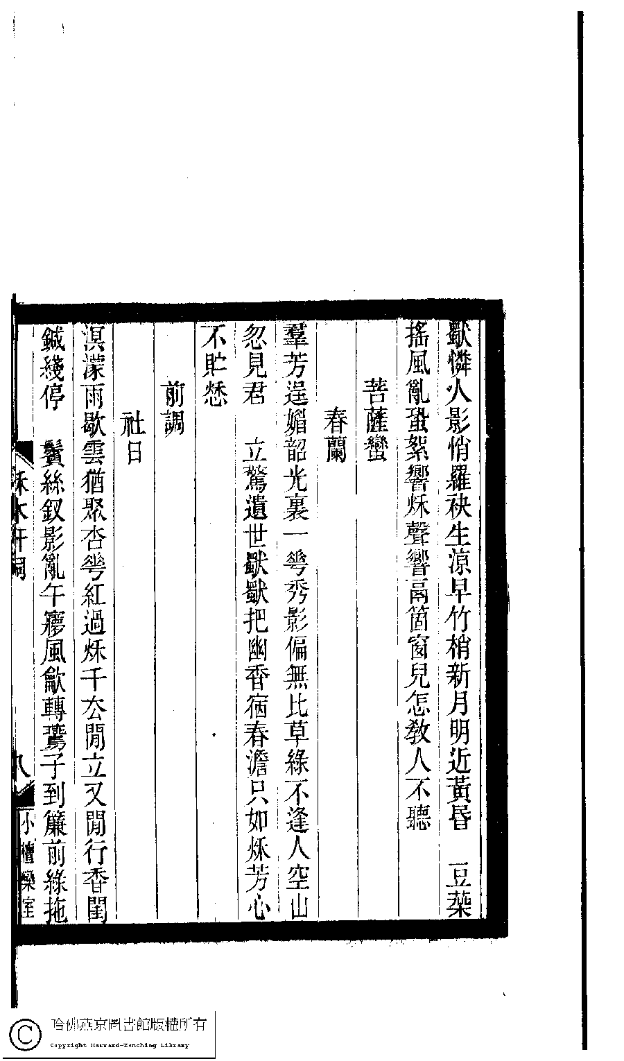 | Appears in: Xiao tan luan shi hui ke gui xiu ci: 10 ji 100 zhong 100 juan (edited by Xu Naichang, Qing dynasty): Qiu shui xuan ci: 1 juan |