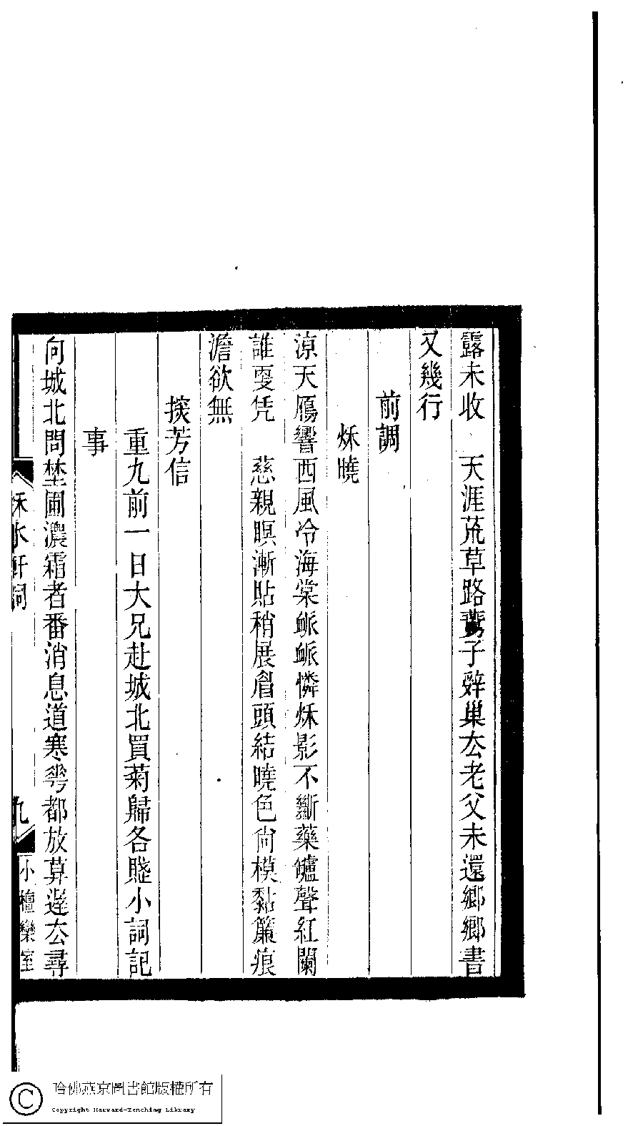 | (PRINT FRIENDLY VERSION) 小檀欒室彙刻閨秀詞﹕十集一百種一百卷(清徐乃昌輯) : 秋水軒詞﹕一卷。清光緒二十二年(1896)南陵徐氏刻本。 ![]() Page : 秋水軒詞.9b | click for larger image | 小檀欒室彙刻閨秀詞﹕十集一百種一百卷(清徐乃昌輯) : 秋水軒詞﹕一卷。清光緒二十二年(1896)南陵徐氏刻本。![]() Page : 秋水軒詞.9a | click for larger image | Back |