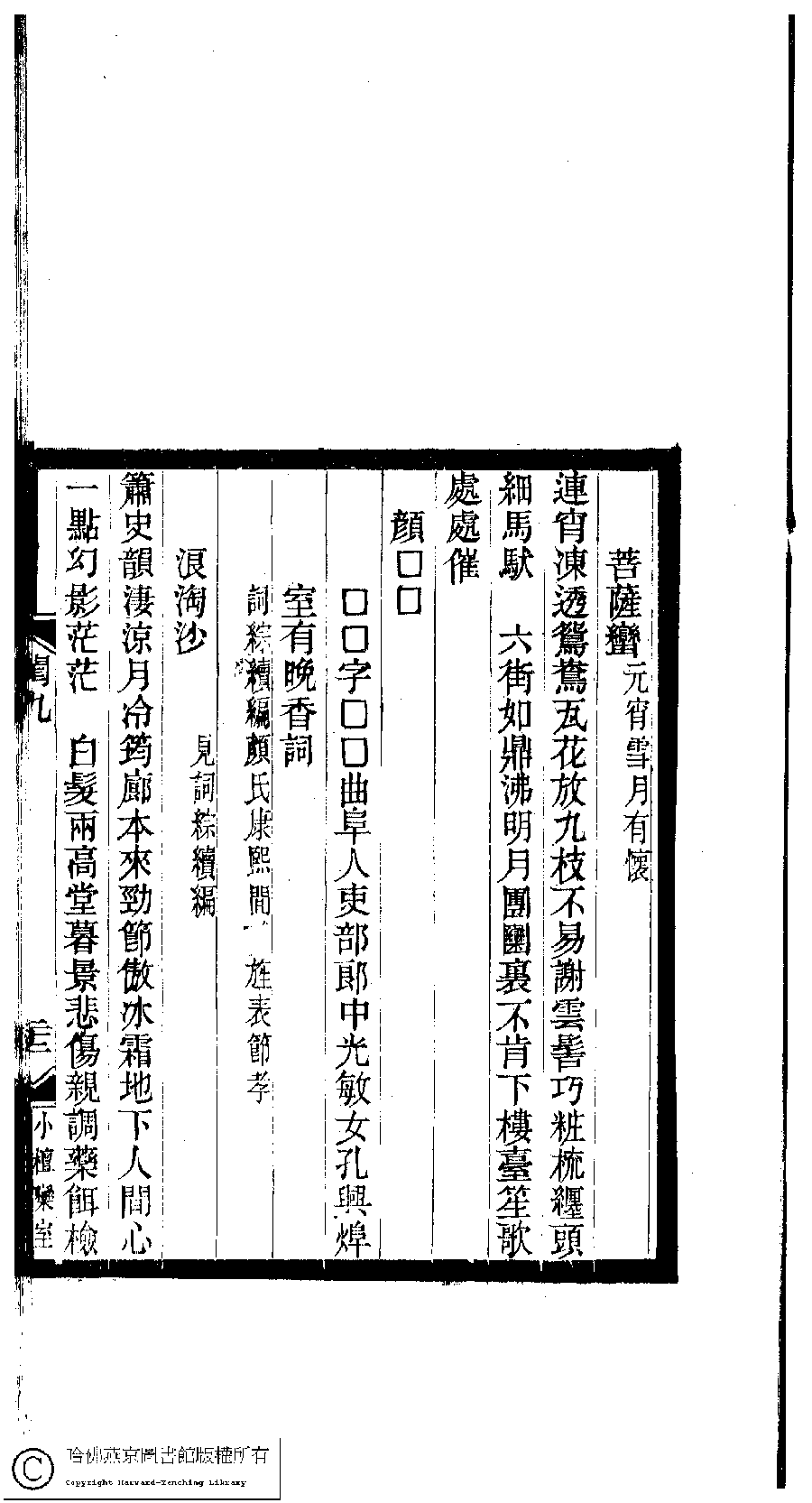 | (PRINT FRIENDLY VERSION) 閨秀詞鈔﹕十六卷(清徐乃昌輯)。清宣統元年(1909)小檀欒室刻本。 ![]() Page : 9.22a | click for larger image | Back |
