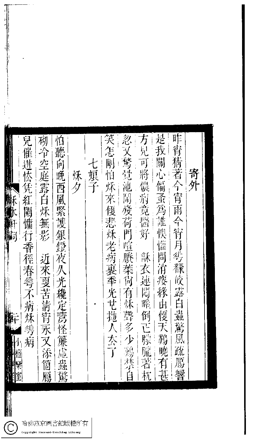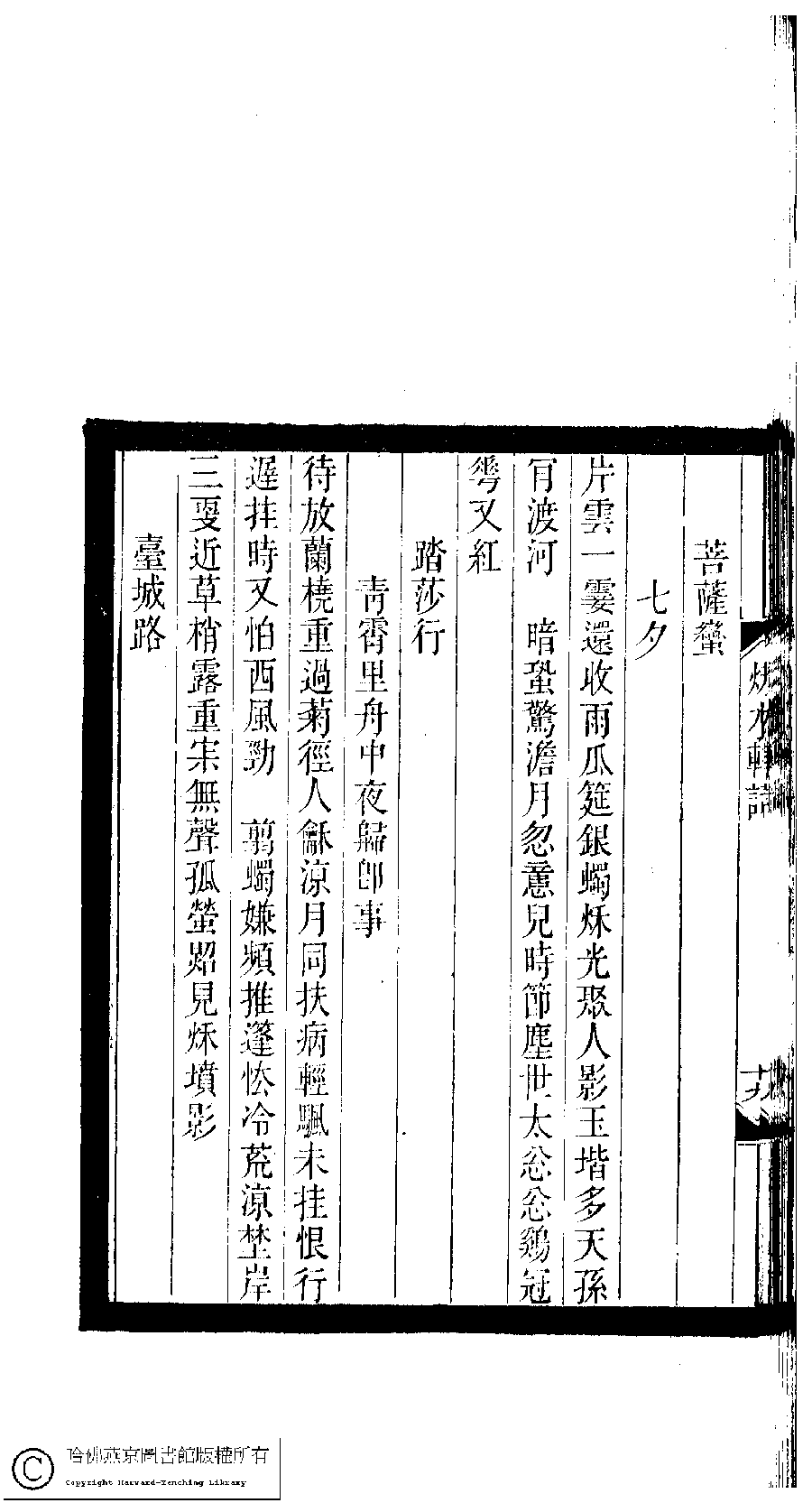 | Appears in: Xiao tan luan shi hui ke gui xiu ci: 10 ji 100 zhong 100 juan (edited by Xu Naichang, Qing dynasty): Qiu shui xuan ci: 1 juan |