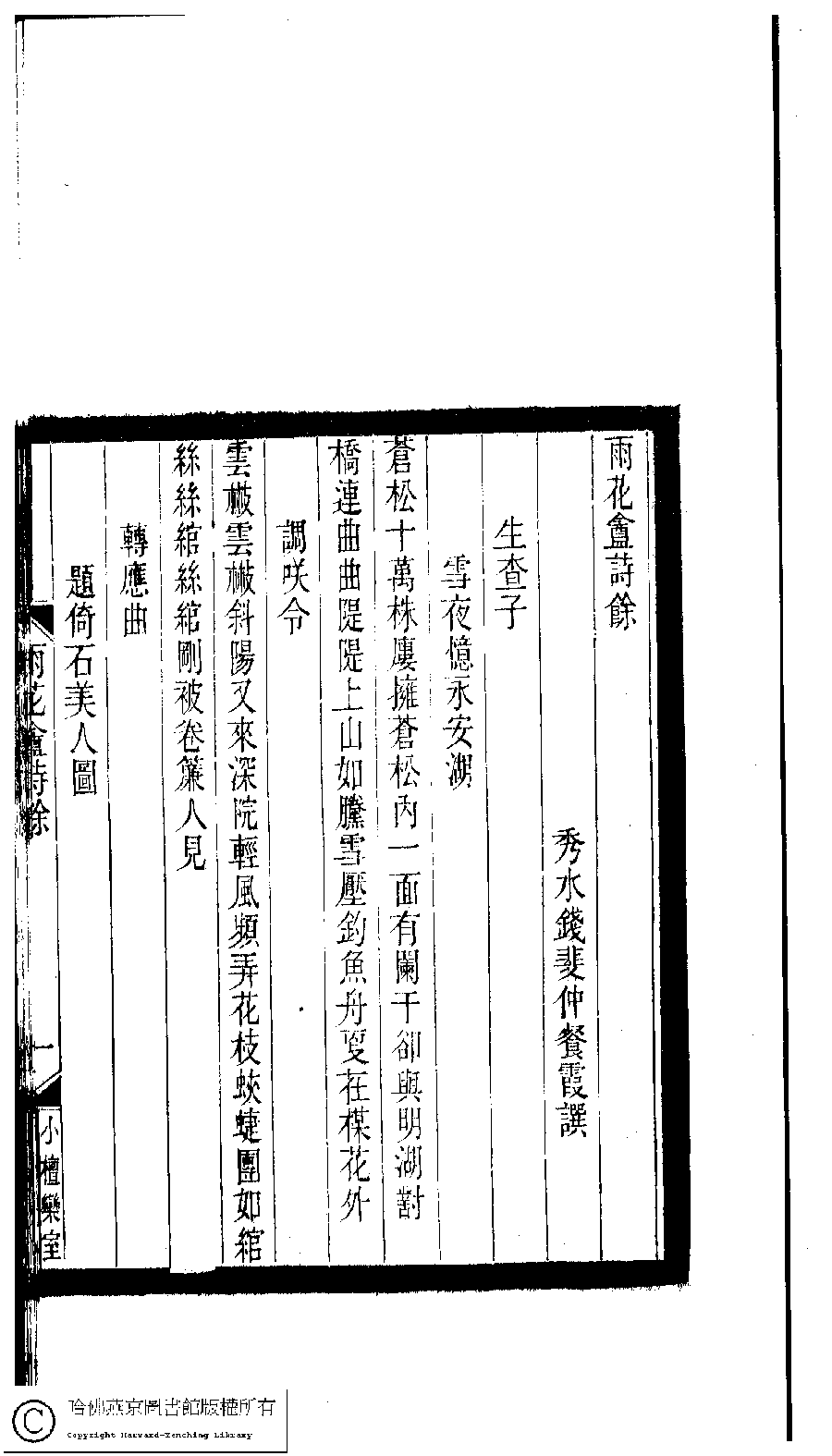 | (PRINT FRIENDLY VERSION) 小檀欒室彙刻閨秀詞﹕十集一百種一百卷(清徐乃昌輯) : 雨花盦詩餘﹕一卷。清光緒二十二年(1896)南陵徐氏刻本。 ![]() Page : 雨花盦詩餘.1b | click for larger image | 小檀欒室彙刻閨秀詞﹕十集一百種一百卷(清徐乃昌輯) : 雨花盦詩餘﹕一卷。清光緒二十二年(1896)南陵徐氏刻本。![]() Page : 雨花盦詩餘.1a | click for larger image | Back |