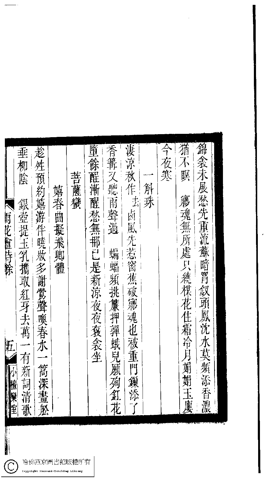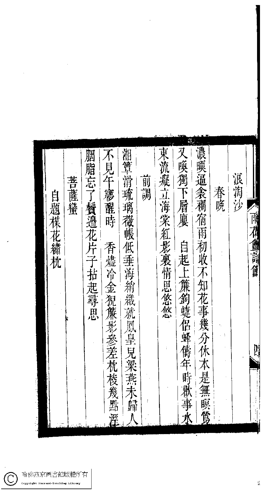 | (PRINT FRIENDLY VERSION) 小檀欒室彙刻閨秀詞﹕十集一百種一百卷(清徐乃昌輯) : 雨花盦詩餘﹕一卷。清光緒二十二年(1896)南陵徐氏刻本。 ![]() Page : 雨花盦詩餘.5a | click for larger image | 小檀欒室彙刻閨秀詞﹕十集一百種一百卷(清徐乃昌輯) : 雨花盦詩餘﹕一卷。清光緒二十二年(1896)南陵徐氏刻本。![]() Page : 雨花盦詩餘.4b | click for larger image | Back |