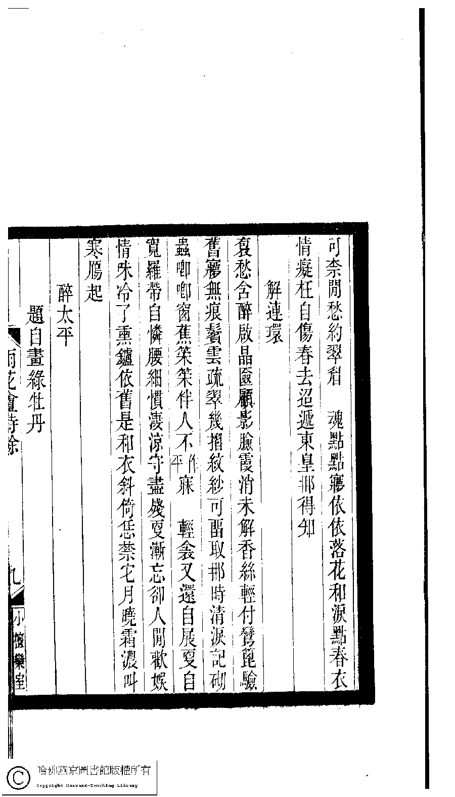 | (PRINT FRIENDLY VERSION) 小檀欒室彙刻閨秀詞﹕十集一百種一百卷(清徐乃昌輯) : 雨花盦詩餘﹕一卷。清光緒二十二年(1896)南陵徐氏刻本。 ![]() Page : 雨花盦詩餘.9a | click for larger image | Back |