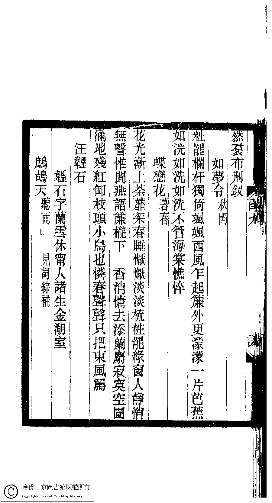 | (PRINT FRIENDLY VERSION) 閨秀詞鈔﹕十六卷(清徐乃昌輯)。清宣統元年(1909)小檀欒室刻本。 ![]() Page : 9.24b | click for larger image | Back |