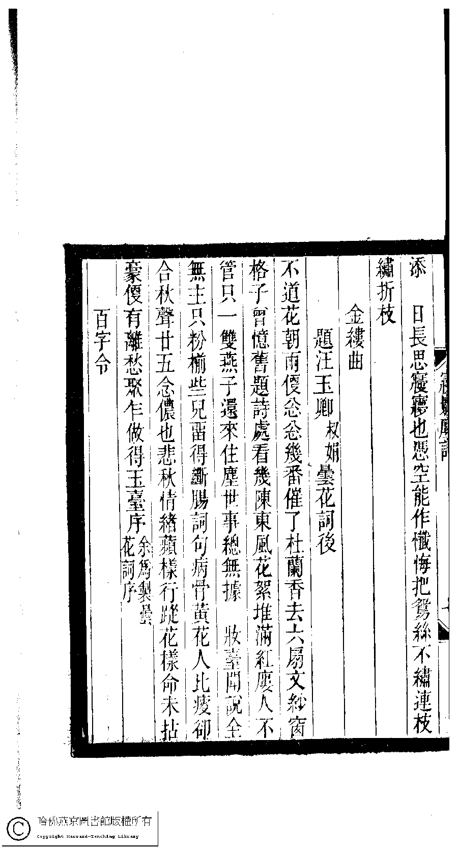 | (PRINT FRIENDLY VERSION) 小檀欒室彙刻閨秀詞﹕十集一百種一百卷(清徐乃昌輯) : 夢影樓詞﹕一卷。清光緒二十二年(1896)南陵徐氏刻本。 ![]() Page : 夢影樓詞.7b | click for larger image | 小檀欒室彙刻閨秀詞﹕十集一百種一百卷(清徐乃昌輯) : 夢影樓詞﹕一卷。清光緒二十二年(1896)南陵徐氏刻本。![]() Page : 夢影樓詞.7a | click for larger image | Back |