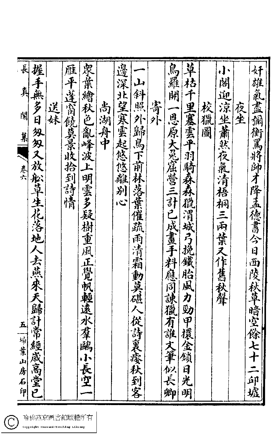 | (PRINT FRIENDLY VERSION) 長真閣集﹕七卷﹐詩餘﹕一卷(清席佩蘭撰)。民國九年(1920)掃葉山房石印本。 ![]() Page : 6.5a | click for larger image | Back |