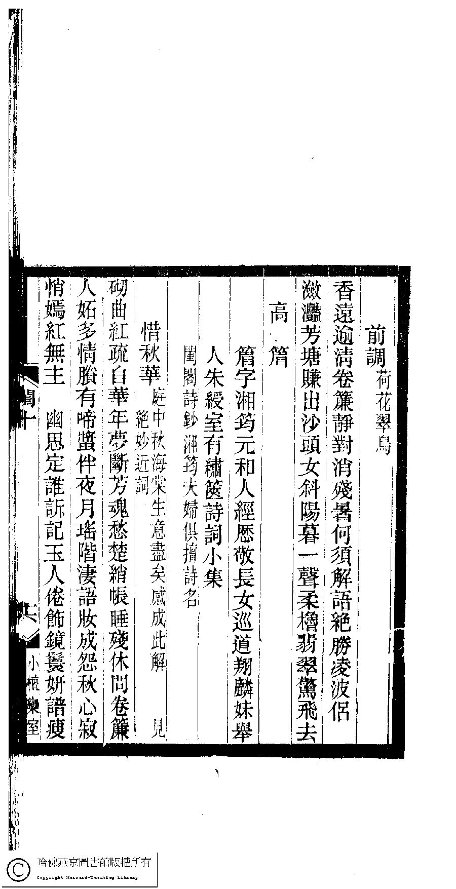 | (PRINT FRIENDLY VERSION) 閨秀詞鈔﹕十六卷(清徐乃昌輯)。清宣統元年(1909)小檀欒室刻本。 ![]() Page : 10.16a | click for larger image | Back |
