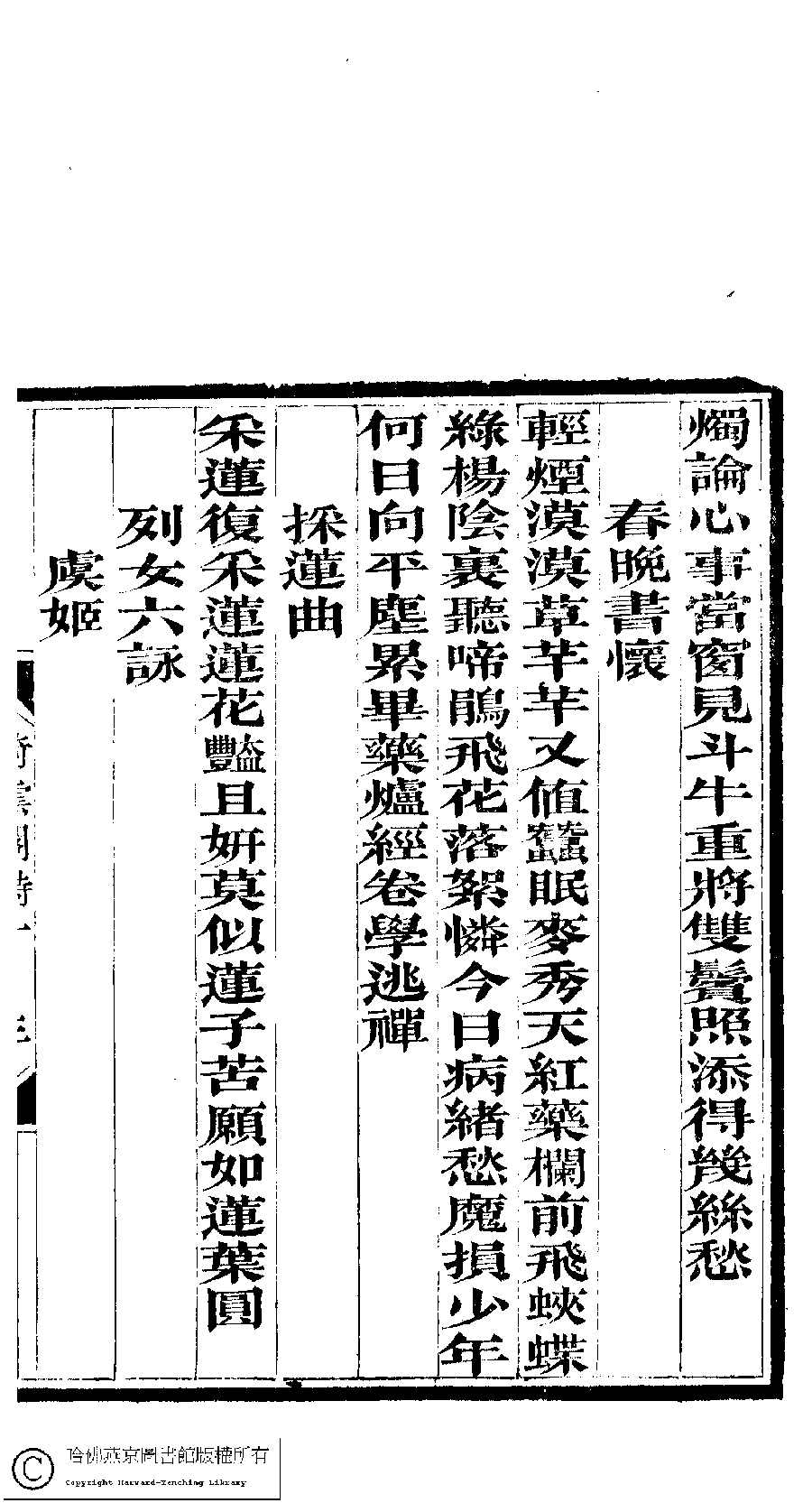 | (PRINT FRIENDLY VERSION) 倚雲閣詩存﹕三卷﹐補遺﹕一卷﹐詩餘存﹕三卷(清張友書撰)。清光緒十二年(1886)刻本。 ![]() Page : 1.3a | click for larger image | Back |