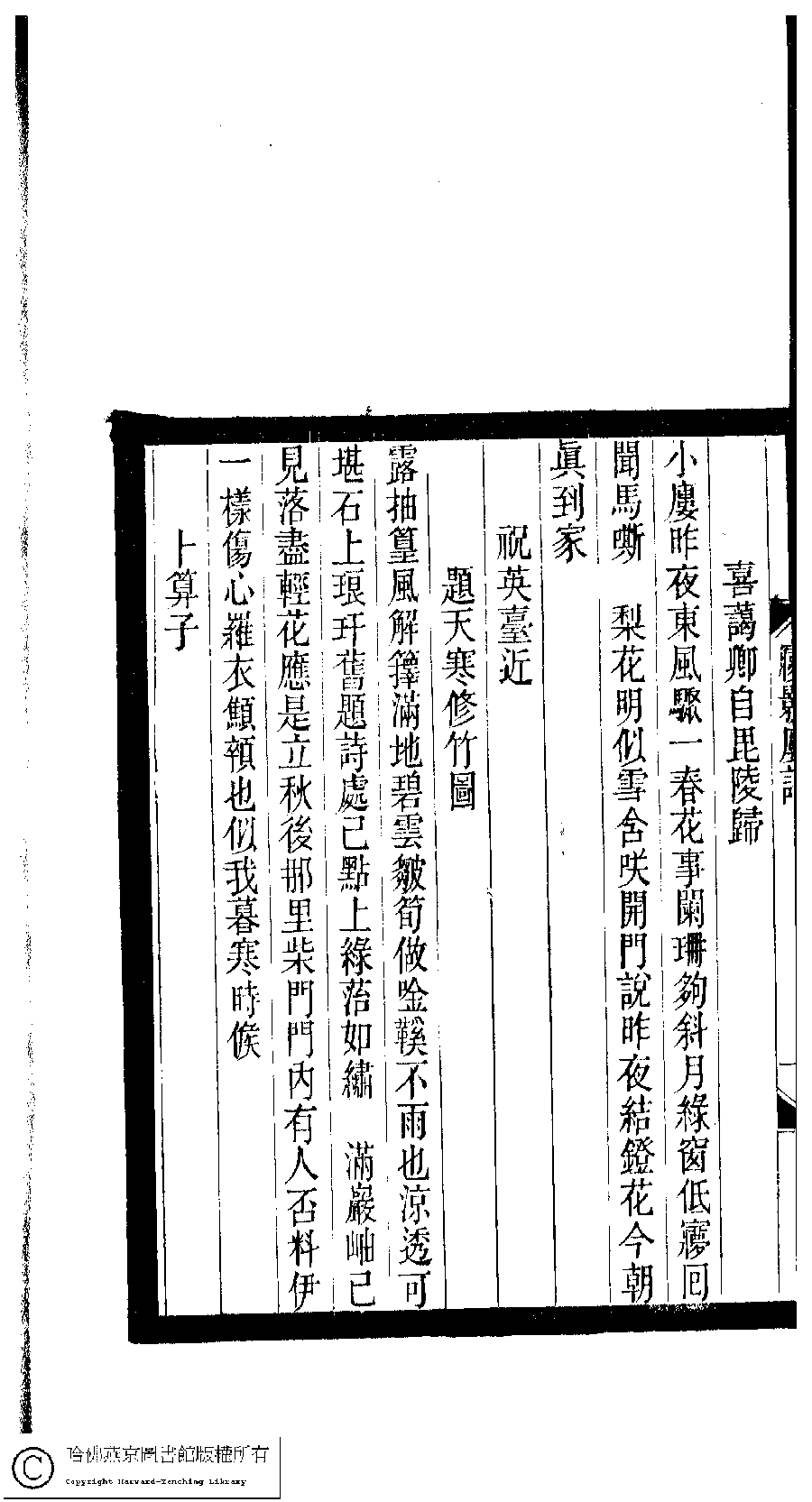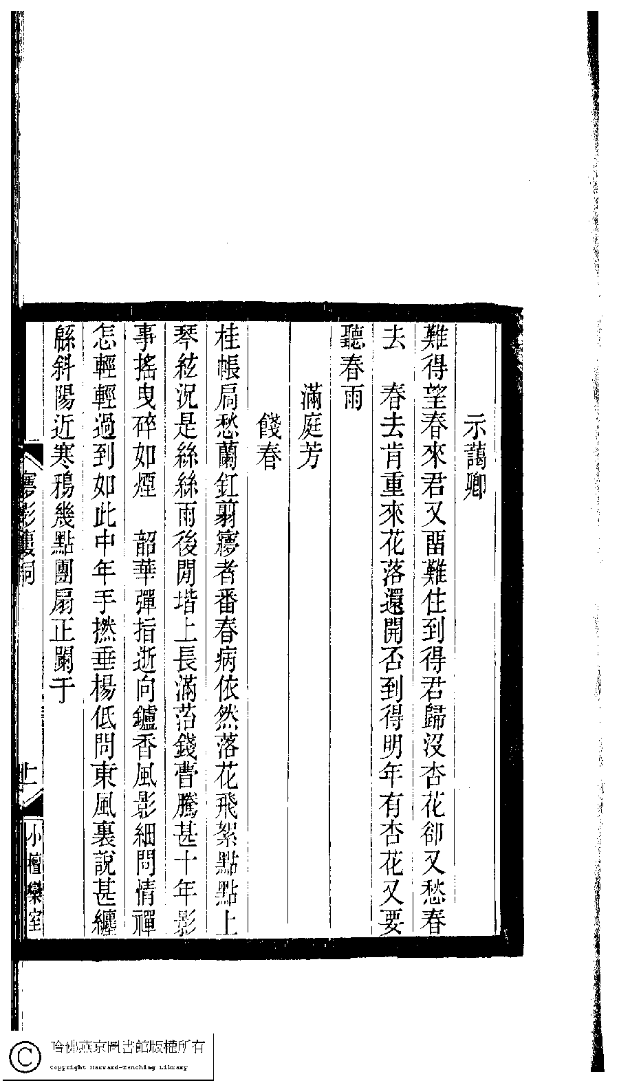 | (PRINT FRIENDLY VERSION) 小檀欒室彙刻閨秀詞﹕十集一百種一百卷(清徐乃昌輯) : 夢影樓詞﹕一卷。清光緒二十二年(1896)南陵徐氏刻本。 ![]() Page : 夢影樓詞.11a | click for larger image | 小檀欒室彙刻閨秀詞﹕十集一百種一百卷(清徐乃昌輯) : 夢影樓詞﹕一卷。清光緒二十二年(1896)南陵徐氏刻本。![]() Page : 夢影樓詞.10b | click for larger image | Back |