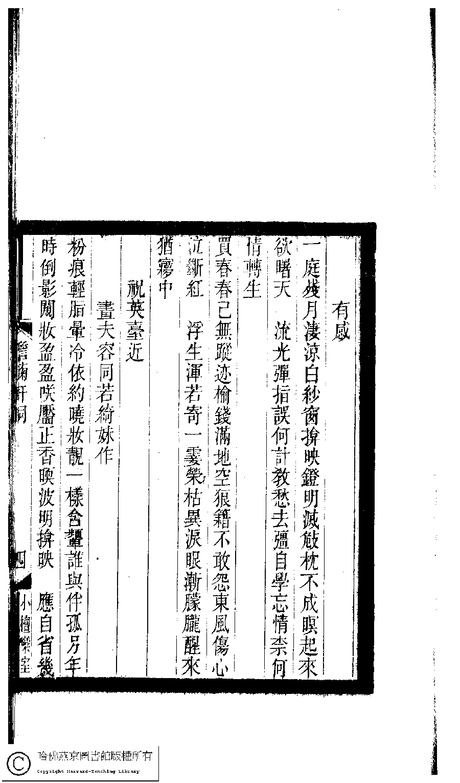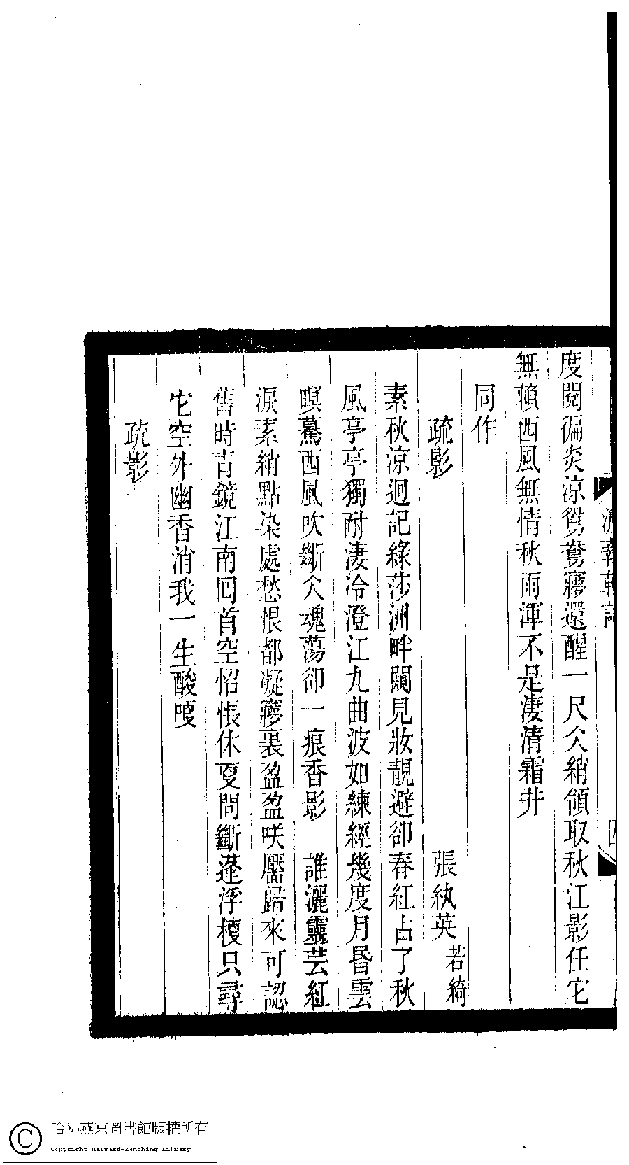 | (PRINT FRIENDLY VERSION) 小檀欒室彙刻閨秀詞﹕十集一百種一百卷(清徐乃昌輯) : 澹菊軒詞﹕一卷。清光緒二十二年(1896)南陵徐氏刻本。 ![]() Page : 澹菊軒詞.4b | click for larger image | 小檀欒室彙刻閨秀詞﹕十集一百種一百卷(清徐乃昌輯) : 澹菊軒詞﹕一卷。清光緒二十二年(1896)南陵徐氏刻本。![]() Page : 澹菊軒詞.4a | click for larger image | Back |