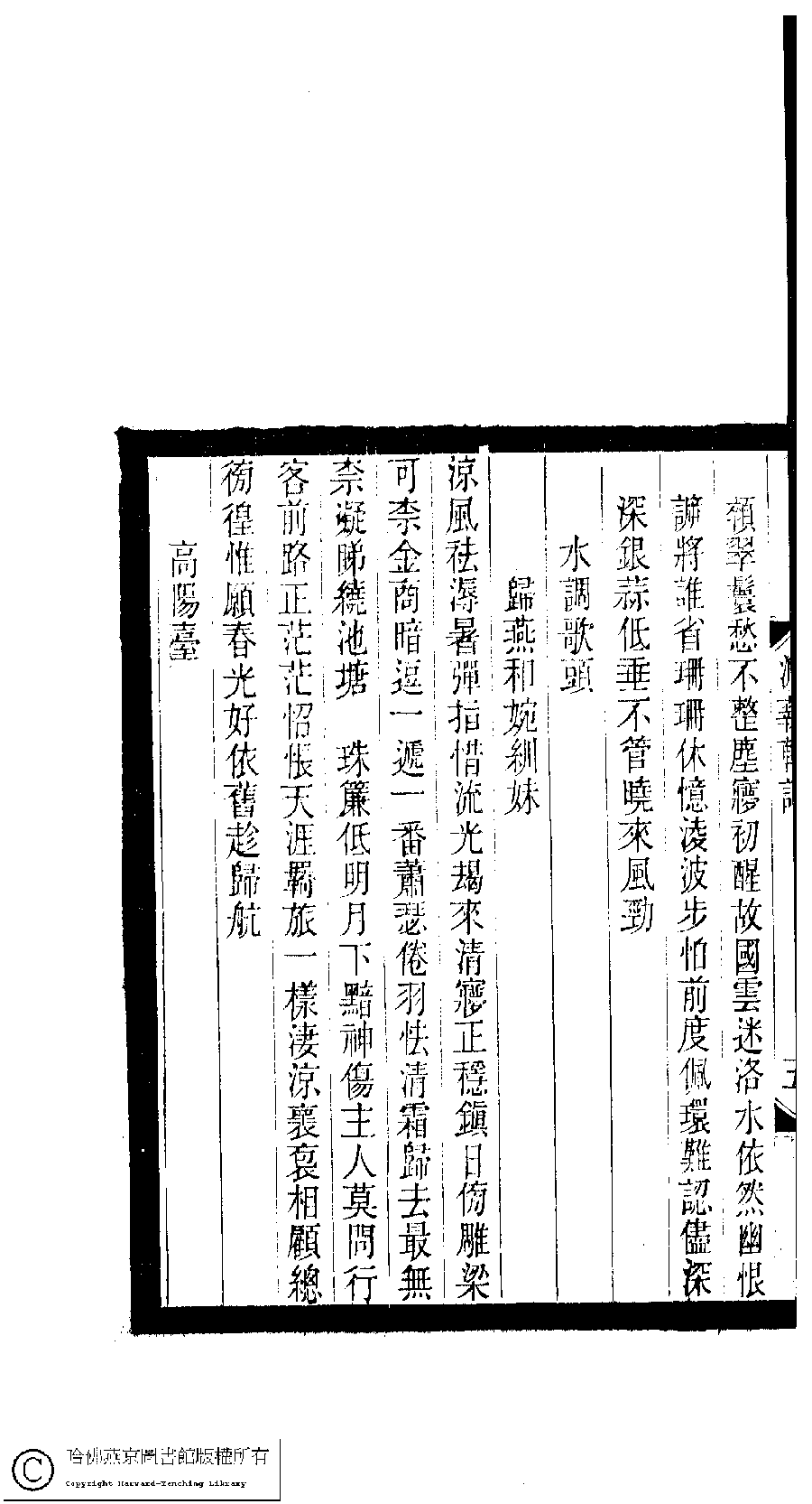 | (PRINT FRIENDLY VERSION) 小檀欒室彙刻閨秀詞﹕十集一百種一百卷(清徐乃昌輯) : 澹菊軒詞﹕一卷。清光緒二十二年(1896)南陵徐氏刻本。 ![]() Page : 澹菊軒詞.5b | click for larger image | 小檀欒室彙刻閨秀詞﹕十集一百種一百卷(清徐乃昌輯) : 澹菊軒詞﹕一卷。清光緒二十二年(1896)南陵徐氏刻本。![]() Page : 澹菊軒詞.5a | click for larger image | 小檀欒室彙刻閨秀詞﹕十集一百種一百卷(清徐乃昌輯) : 澹菊軒詞﹕一卷。清光緒二十二年(1896)南陵徐氏刻本。![]() Page : 澹菊軒詞.4b | click for larger image | Back |